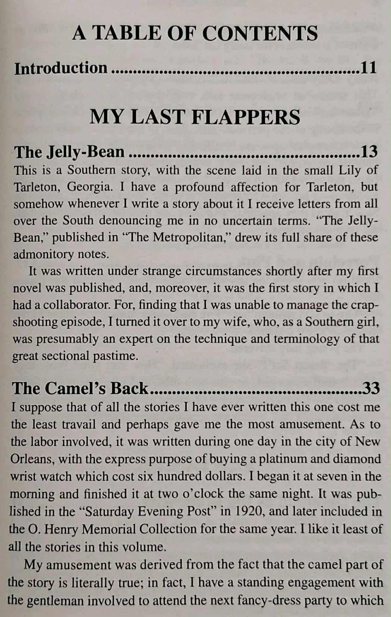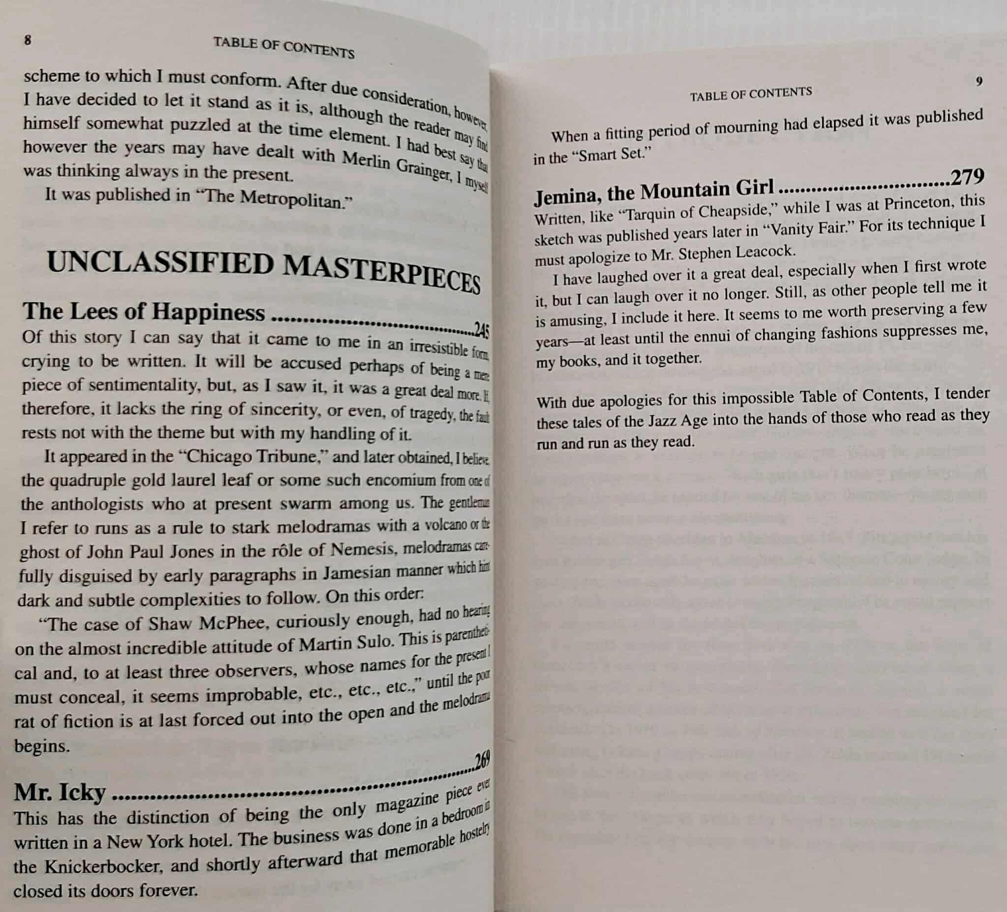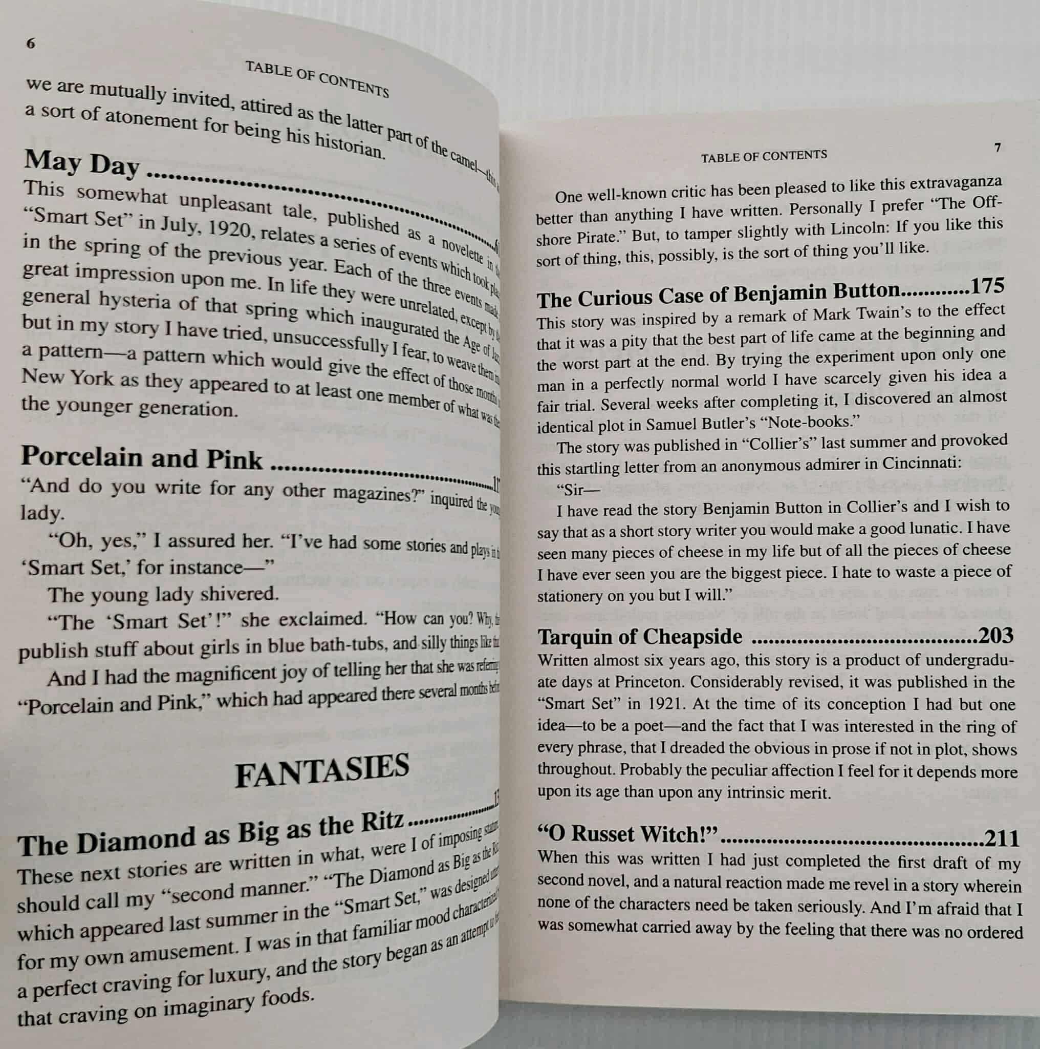 Included in this volume are eleven of Fitzgerald's jazz-age stories: 1) The Jelly-Bean, 2) The Camel's Back, 3) May Day, 4) Porcelain and Pink, 5) The Diamond as Big as the Ritz, 6) The Curious Case of Benjamin Button, 7) Tarquin of Cheapside, 8) O Russet Witch!, 9) The Less of Happiness, 10) Mr. Icky, and 11) Jemina, The Mountain Girl.