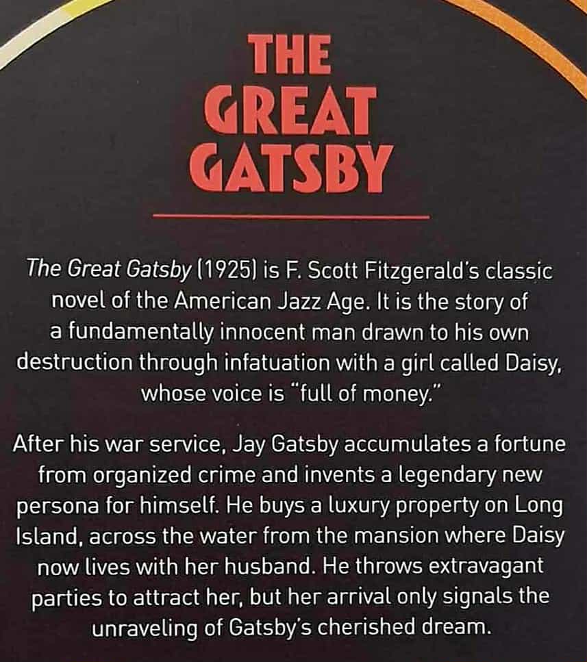 The Great Gatsby is the story is of the fabulously wealthy Jay Gatsby and his new love for the beautiful Miss Daisy Buchanan, of lavish parties on Long Island at a time when The New York Times noted "gin was the national drink and sex the national obsession," and is an exquisitely crafted tale of America in the 1920s.