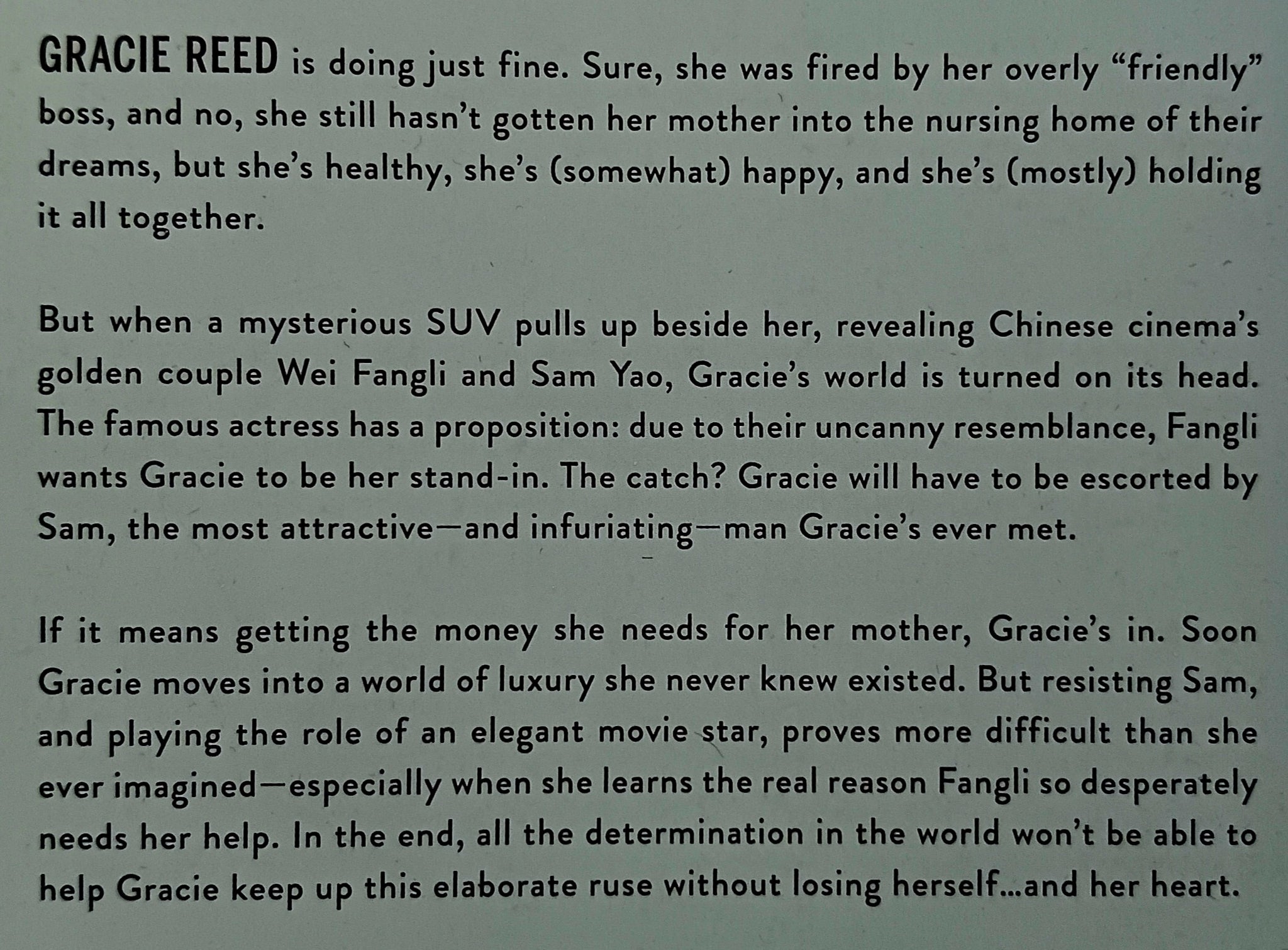 Gracie Reed is mostly keeping things together.  She may have been fired, and funds are tight, but she's healthy, and for the most part happy, so when a mysterious SUV pulls alongside her to reveal Chinese cinema's golden couple Wei Fangli and Sam Yao, she's stunned!  It seems crazy, but due to their uncanny resemblance, Wei wants Gracie to be her stand-in, and the job comes with the money Gracie needs to support her mother.  What could possibly go wrong?
