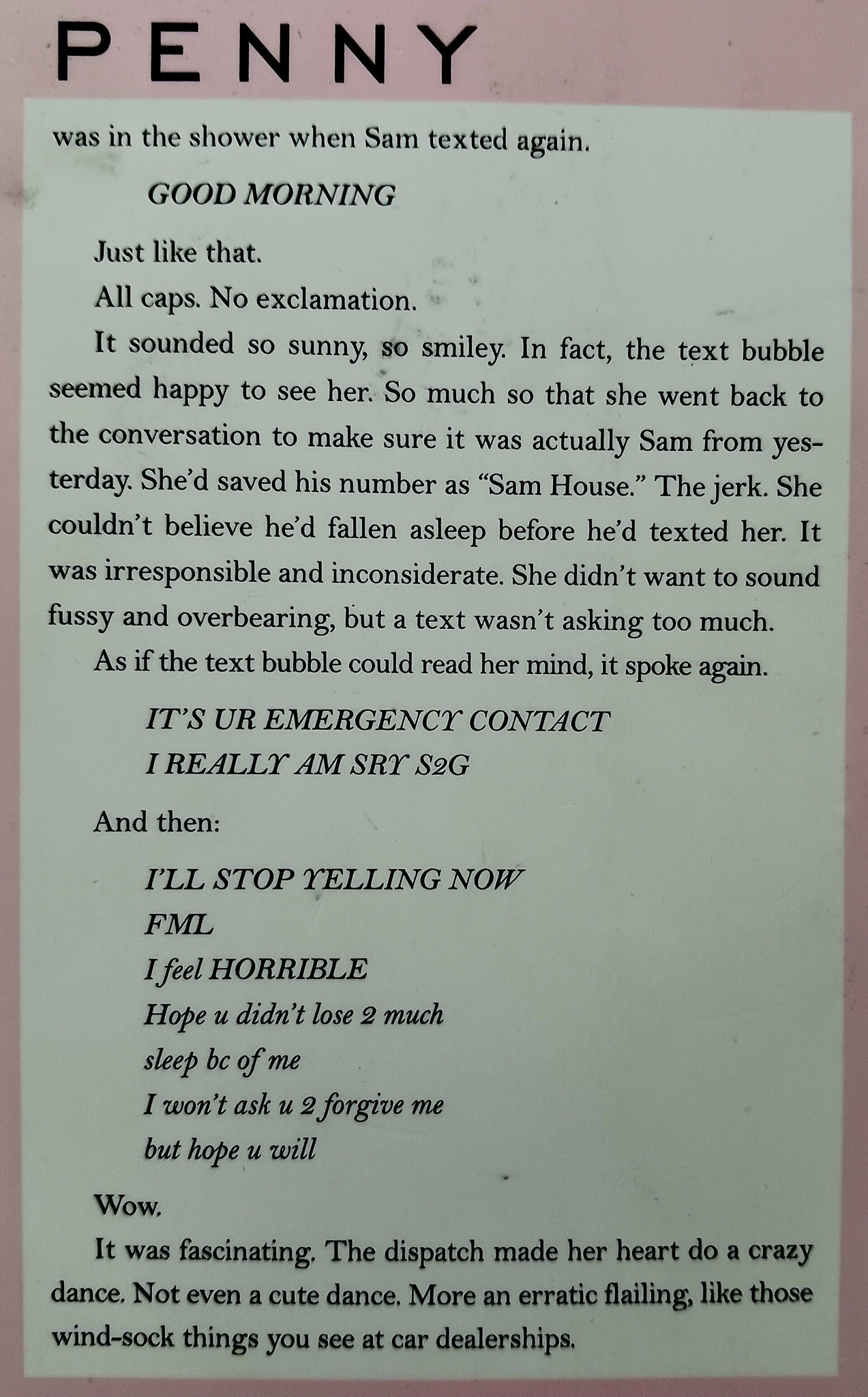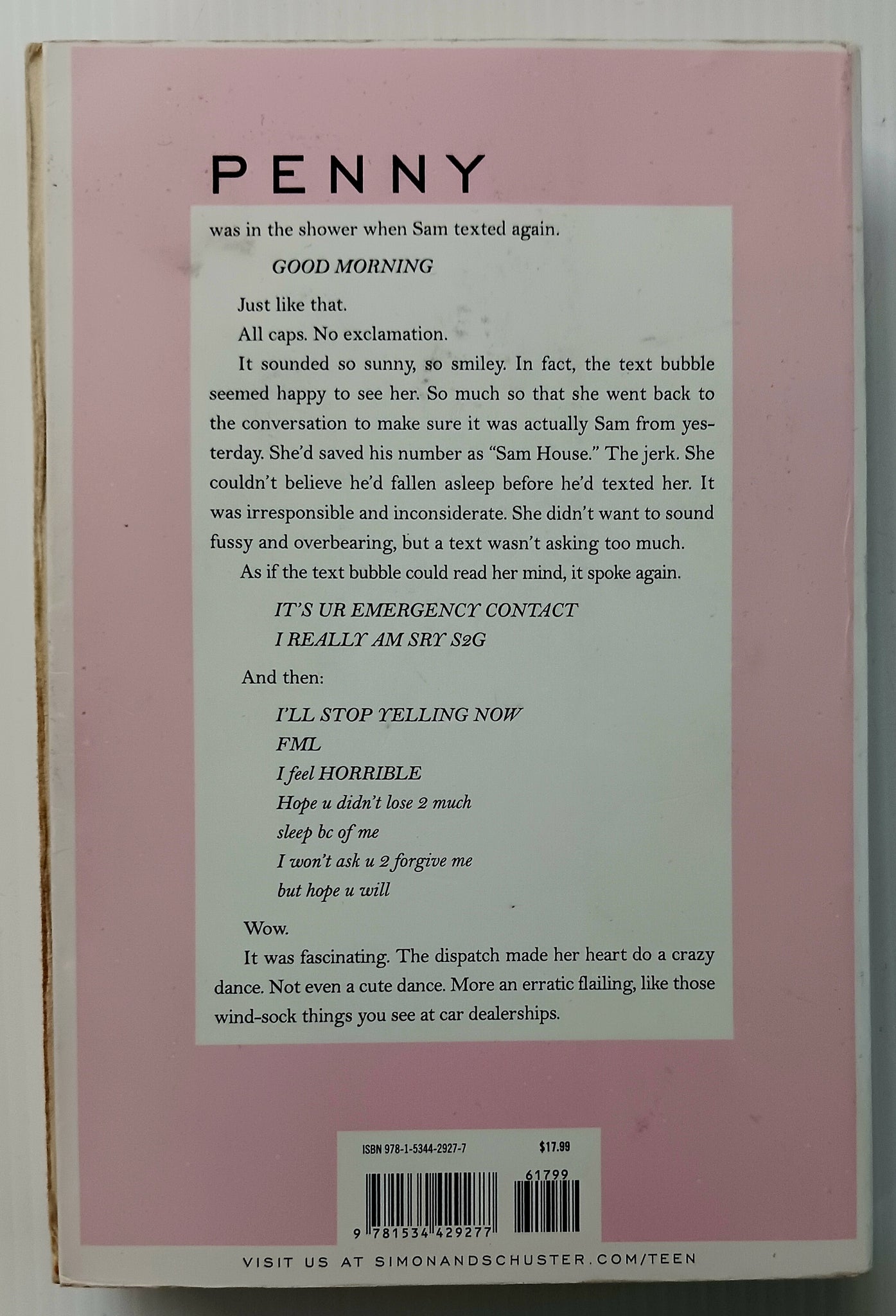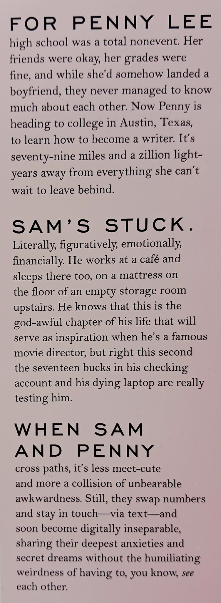 On her way to college in Austen, Texas to study creative writing, Penny Lee is happy to put seventy-nine miles (and a million light years) away from everything she can't wait to leave behind. When she meets stuck-in-a-rut Sam, it's less of a meet-cute and more like a collision of awkwardness, but soon the two become digitally inseparable, sharing their deepest anxieties and secret dreams without all the humiliating weirdness . . .