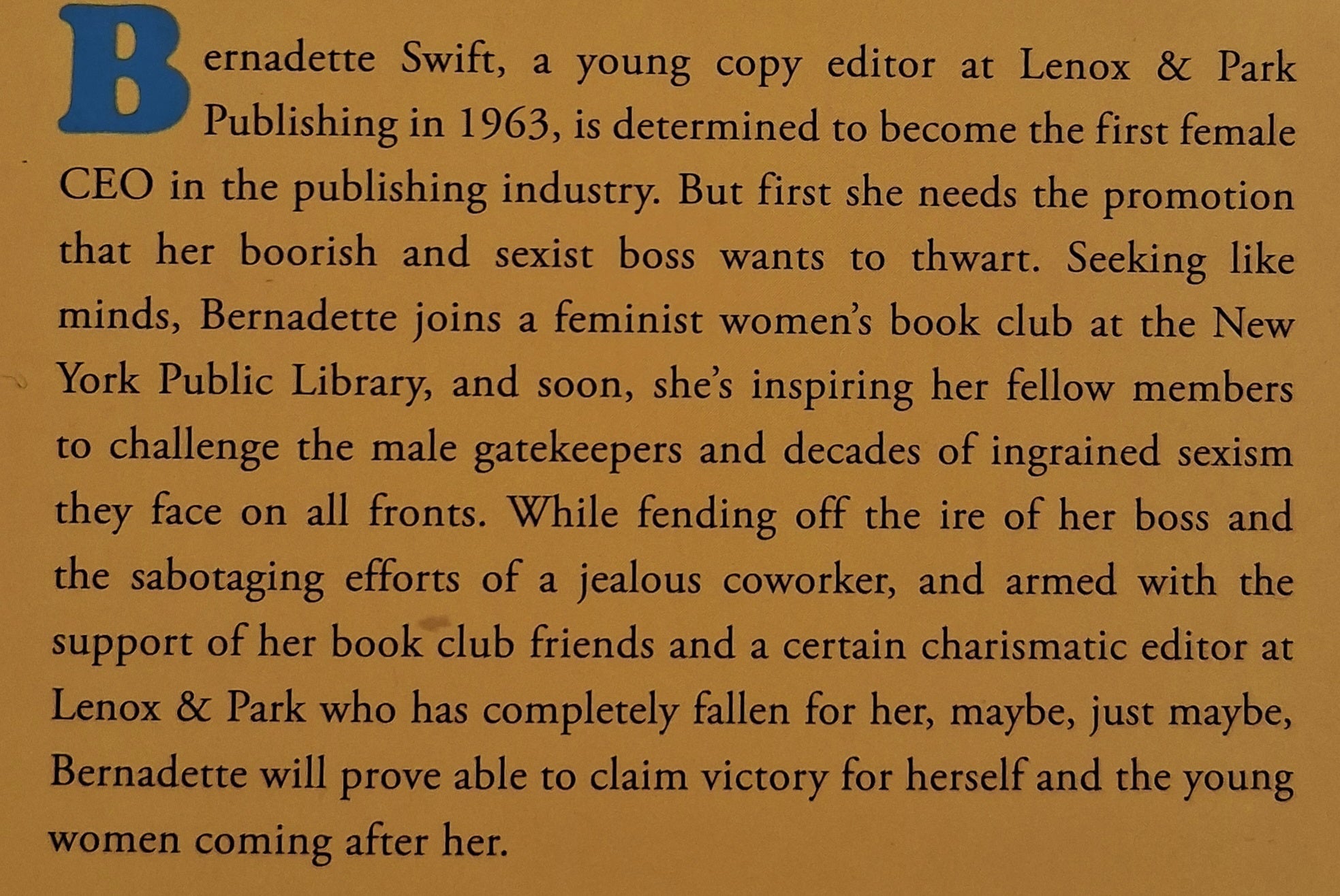 There are no female publishing CEOs in 1960's New York, and that is exactly what savvy, ambitious Bernadette Swift, a young copyeditor at Lenox & Park Publishing plans to change . . .