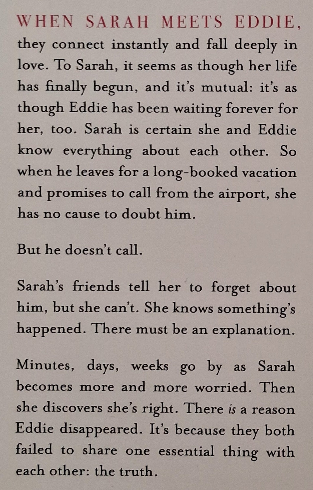 When Sarah meets Eddie, they connect instantly and fall in love. Life has finally begun, and it's mutual. So when Eddie leaves for a long-booked vacation and promises to call from the airport, Sarah has no cause to doubt him, but he doesn't call . . .