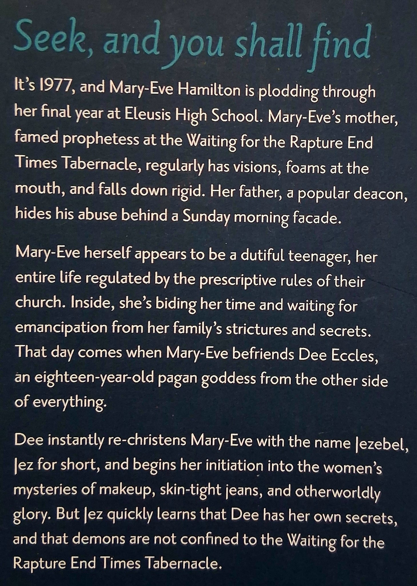 Raised in a highly religious family, Mary-Eve Hamilton finds herself being reborn when she meets Dee Eccles. Stripping away her conservative upbringing and renaming herself Jezebel, it doesn't take 'Jez' long to learn that Dee has her own secrets, and that demons are not only confined to religion . . .