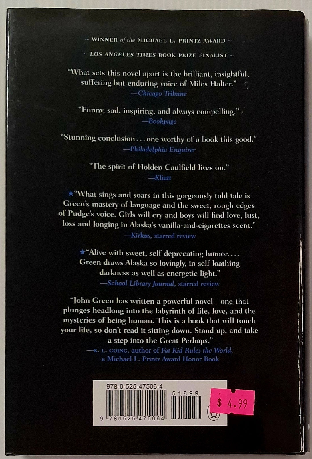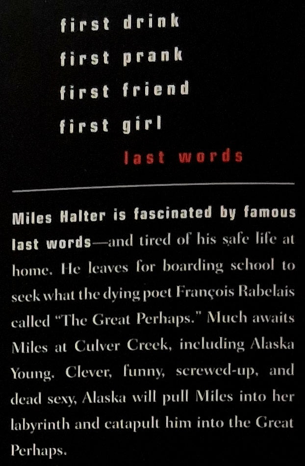 Before: Miles 'Pudge' Halter is done with his big non-event excuse for a life when he arrives at Culver Creek Boarding School and meets the gorgeous, clever, funny, self-destructive, screwed up, and fascinating Alaska Young. After: Nothing will ever be the same . . .