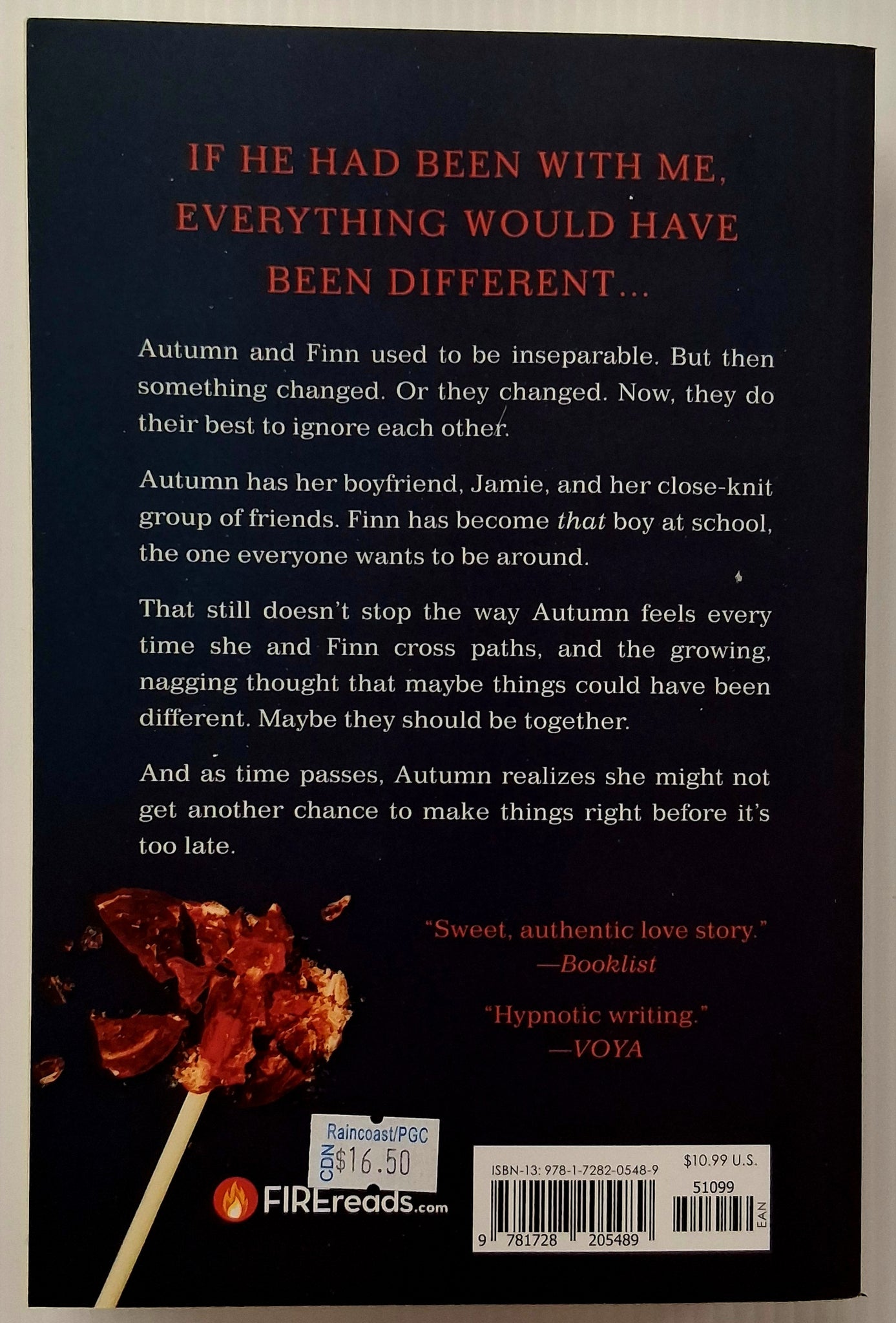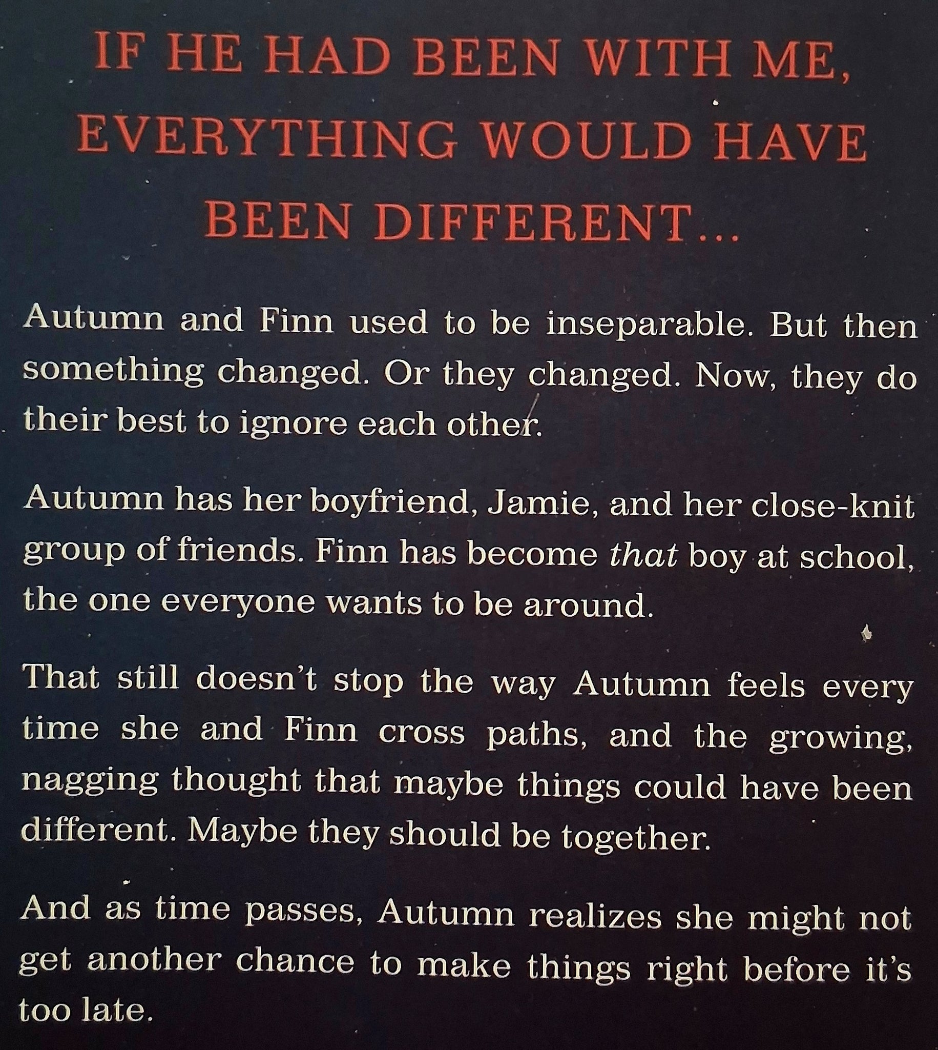 Autumn and Finn used to be inseparable, but now they do there best to ignore each other. Since then, Finn has become the 'It' kid at school and Autumn has tried to move forward with her boyfriend Jamie and her close-knit group of friends, but that hasn't stopped the way she feels inside every time she and Finn cross paths . . .