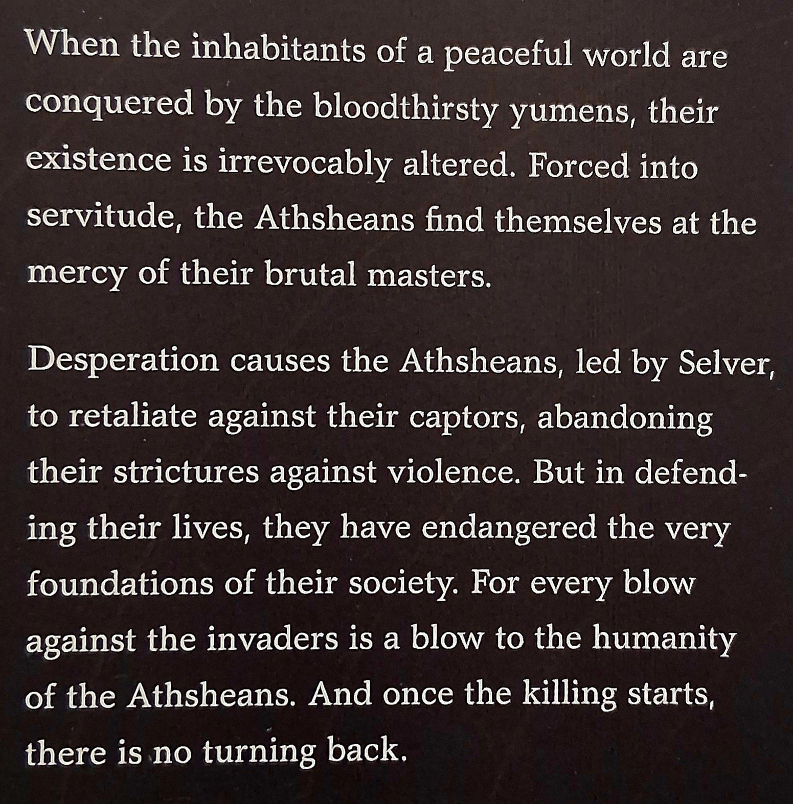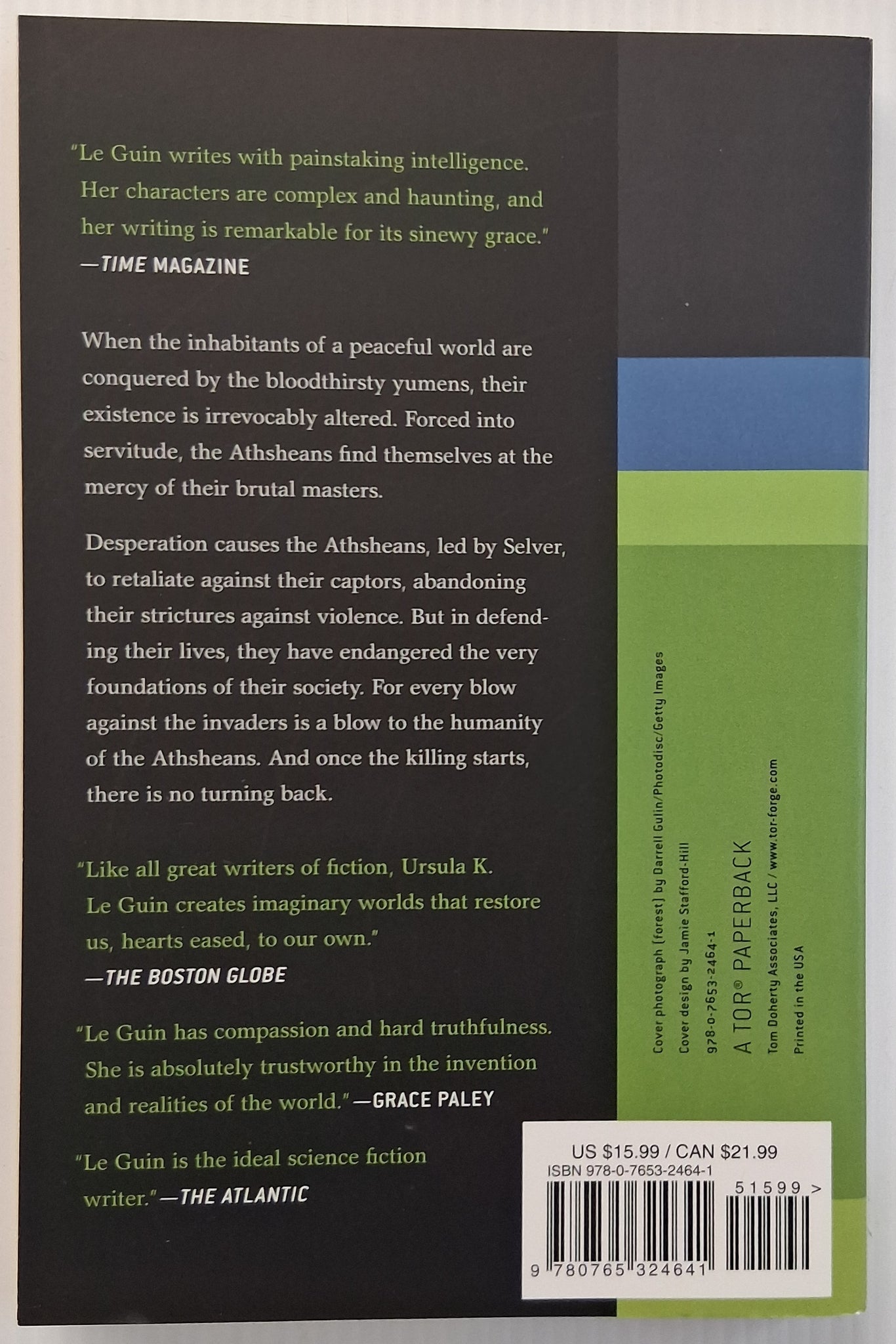 On the densely forested planet Athshe, twenty-seven light-years from Earth, the word for world and forest is the same as the two are inseparable. A matriarchal society where elders are respected and conflicts are resolved through music, the people live off the land and have no concept of war, but when 'Yumens' (humans) arrive with their machines and attempt to harvest wood for themselves, the harmony once enjoyed by the Athsheans ceases to exist . . .