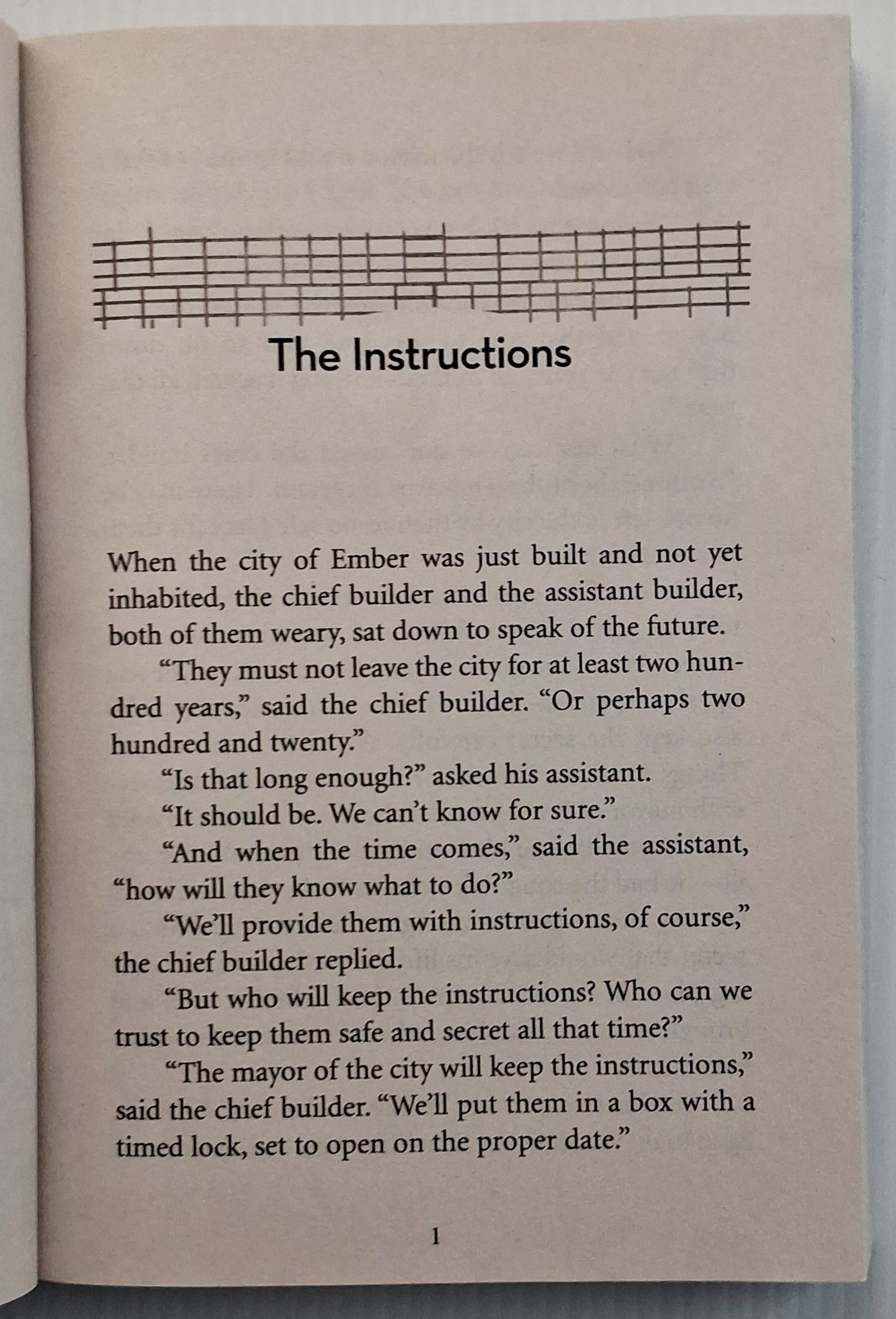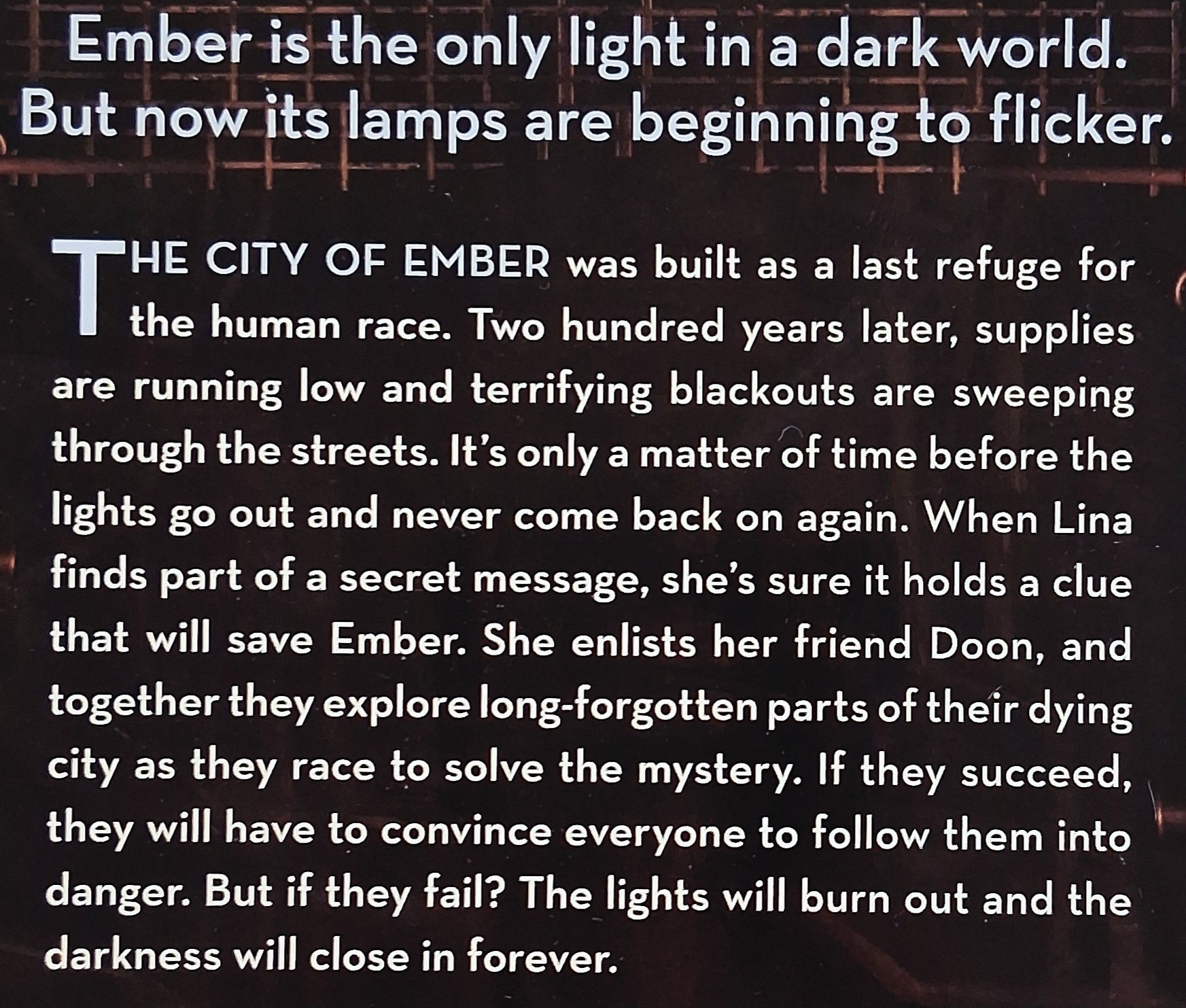 Many years ago, the city of Ember was created by the Builders to contain everything needed for human survival.  It worked for a time, but now the storerooms are almost out of food, crops are blighted, corruption is spreading and worst of all: the lights are failing and the city could soon find itself in darkness.  When two children, Lina and Doon, discover fragments of an ancient parchment, they begin to wonder if there could be a way out of Ember, but even if they can decipher it, will the people of Ember listen to them . . . ?