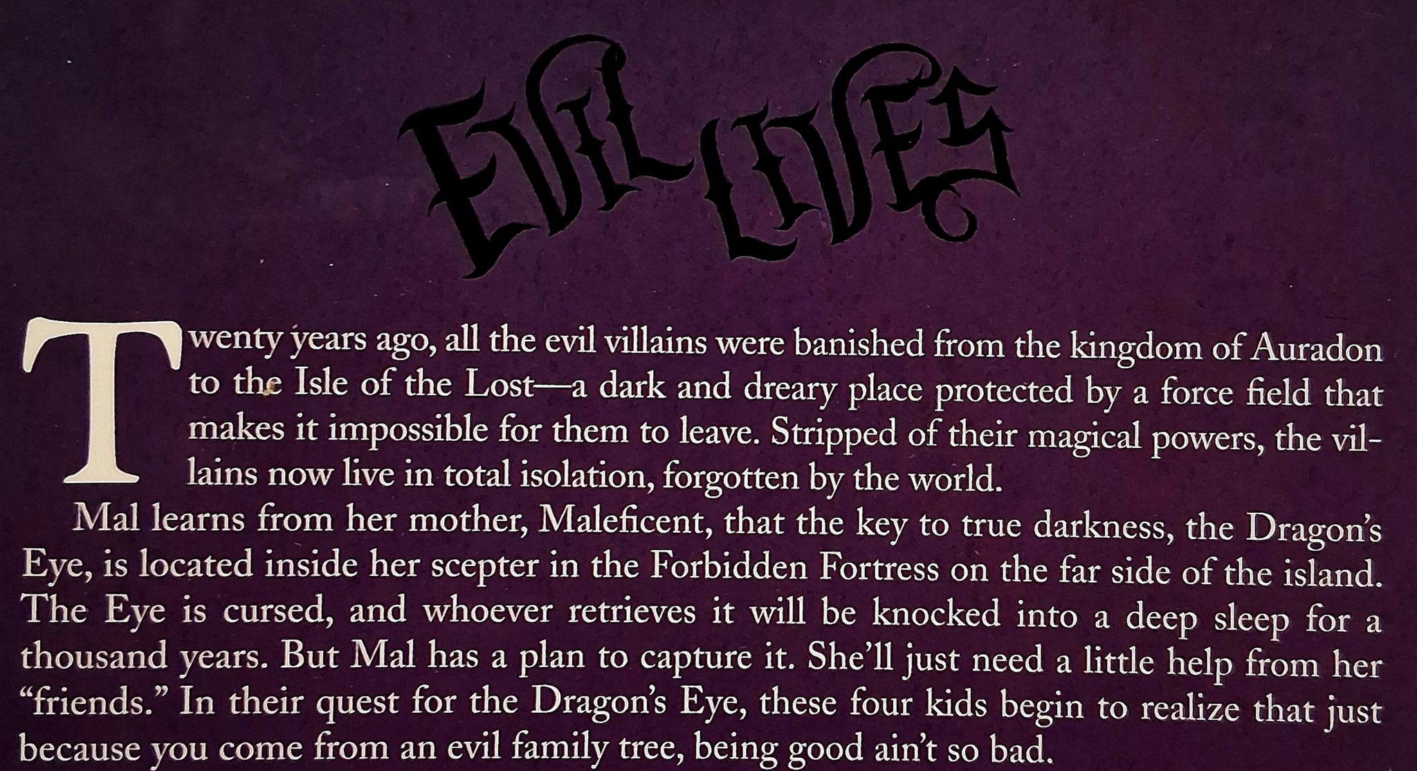 Twenty years ago, all the evil villains were banished from the kingdom of Auradon to the Isle of the Lost--a dark and dreary place protected by a force field that makes it impossible for them to leave. Stripped of their magical powers, the villains now live in total isolation, forgotten by the world, but their descendants are tired of it. Just because you come from an evil family tree, doesn't mean you can't try to be good . . .