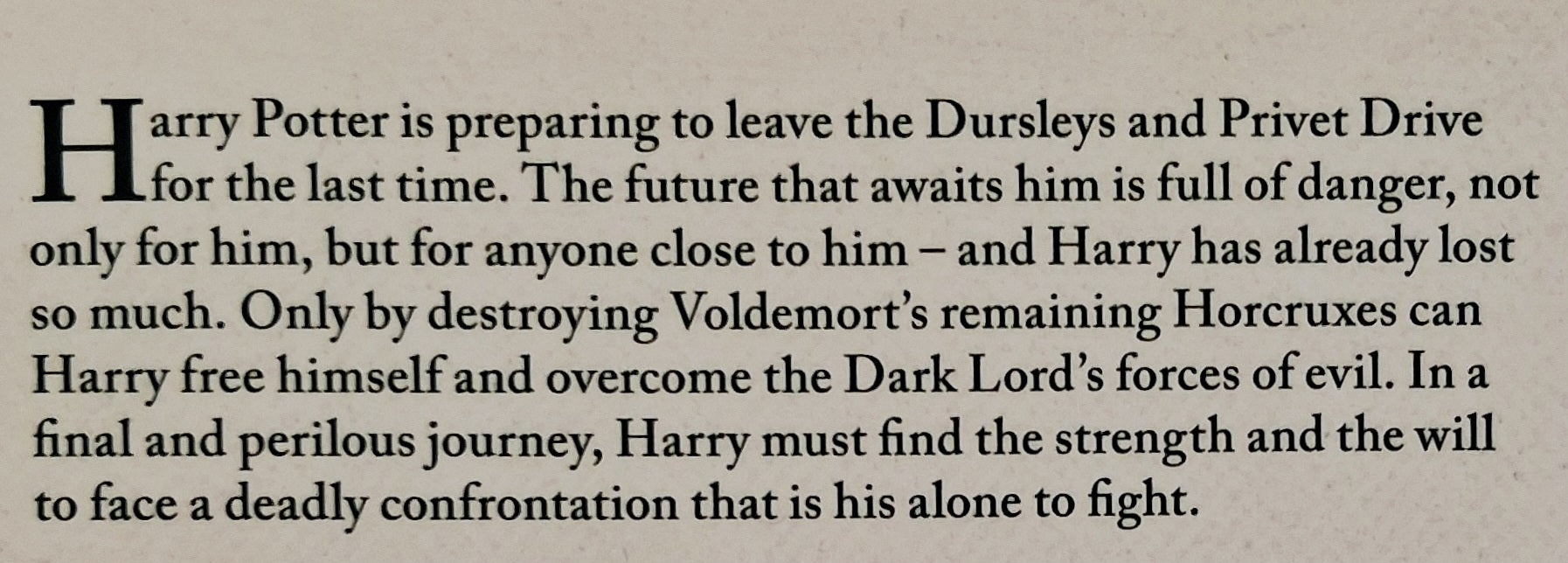 As he climbs into the sidecar of Hagrid's motorbike and takes to the skies, leaving Privet Drive for the last time, Harry Potter knows that Lord Voldemort and the Death Eaters are not far behind. The protective charm that has kept him safe until now is now broken, but he cannot keep hiding. The Dark Lord is breathing fear into everything Harry loves, and to stop him Harry will have to find and destroy the remaining Horcruxes. The final battle must begin; Harry must stand and face his enemy . . .