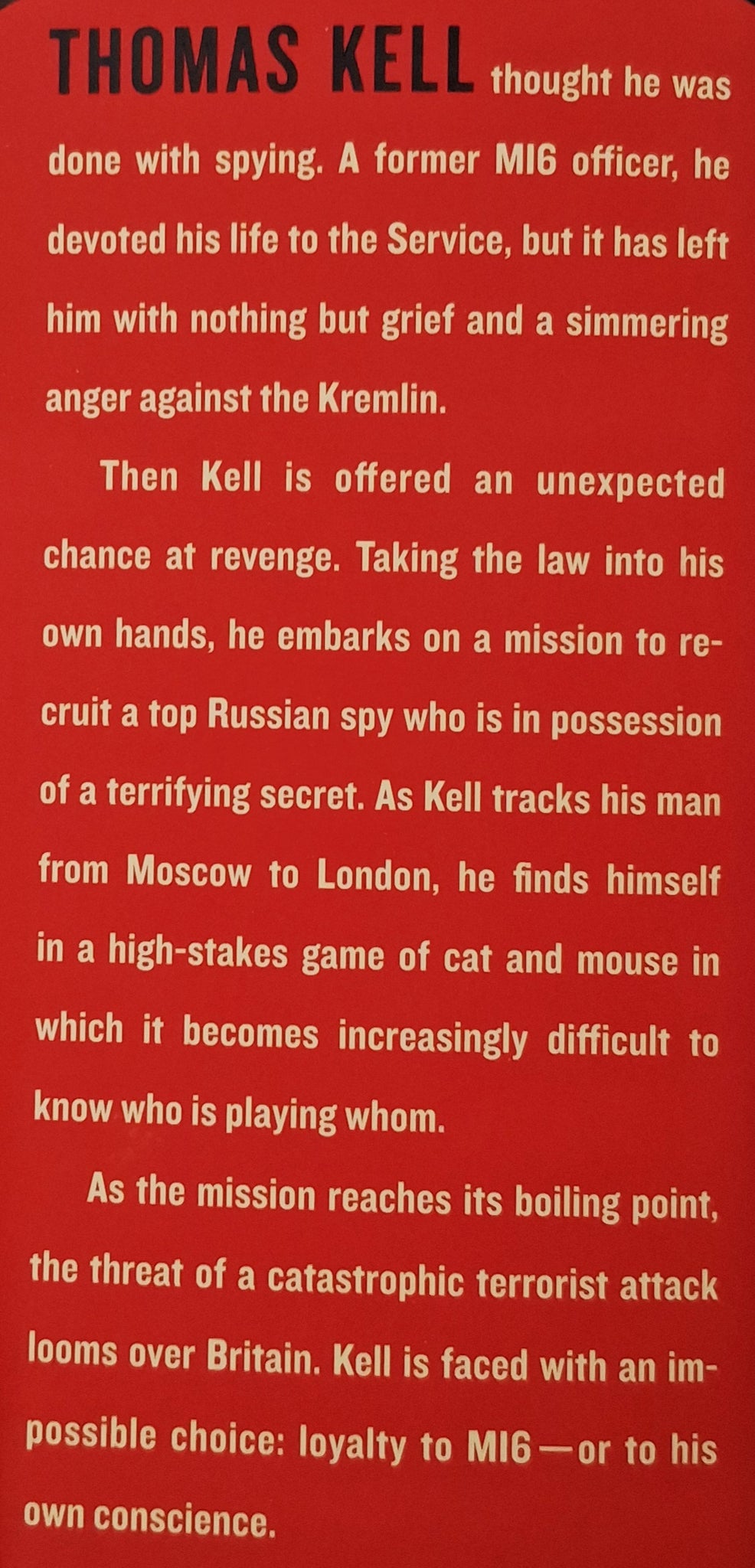 After having devoted his life to the Service, Thomas Kell thought he was done with spying until he was offered an unexpected chance at revenge. Taking the law into his own hands, he embarks on a mission to recruit a top Russian spy who is in possession of a terrifying secret, but as the mission reaches boiling point, Kell is faced with an impossible choice: remain loyal to MI6 or to his own conscience . . . ?