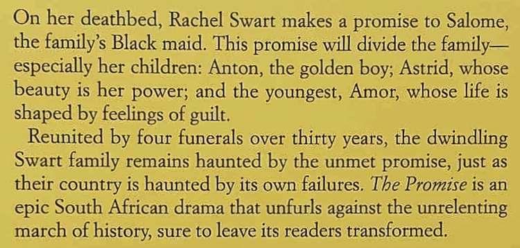 Reunited by three funerals over three decades, the dwindling family at The Promise's center reflect the atmosphere of their country, an atmosphere of resentment, renewal, and possibility in an epic drama that unfurls against the unrelenting march of history.