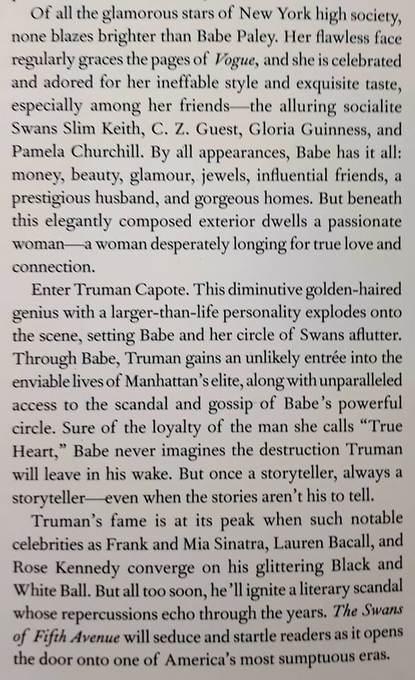 Melanie Benjamin, the New York Times bestselling author of The Aviator's Wife returns with The Swans of Fifth Avenue, a triumphant new novel about New York's 'Swans' of the 1950s, and the scandalous, headline-making, and enthralling friendship between literary legend Truman Capote and peerless socialite Babe Paley.