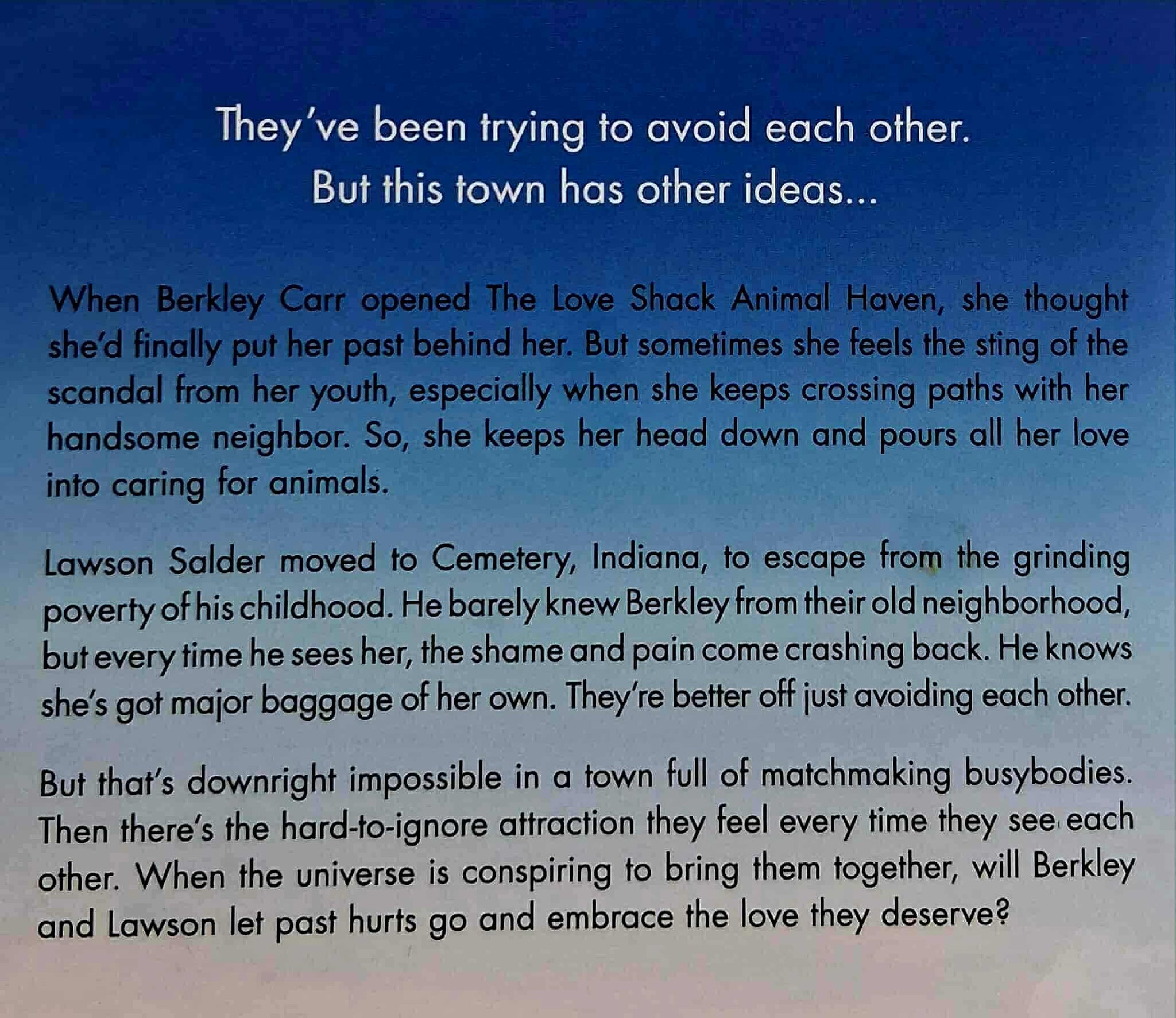 Operating The Love Shack Animal Haven in Cemetery, Indiana keeps Berkley Carr's life plenty rewarding, busy, but when the town busybodies start to exercise their matchmaking skills by pushing Lawson Sadler her way . . .