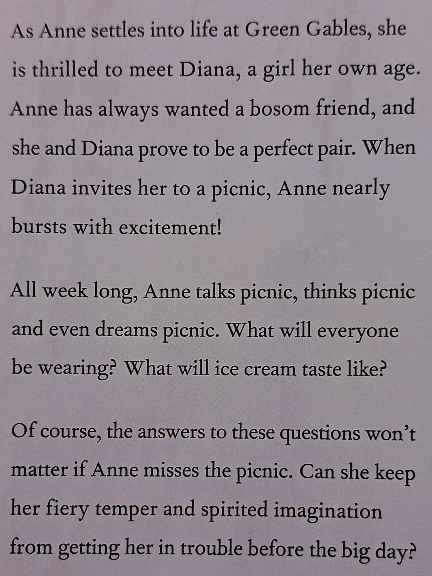Spirited and outspoken Anne Shirley is excited to meet one of her new neighbours at Green Gables Diana Barry, and she's even more thrilled when she finds out that there is to be a picnic with of all things, ice cream!
