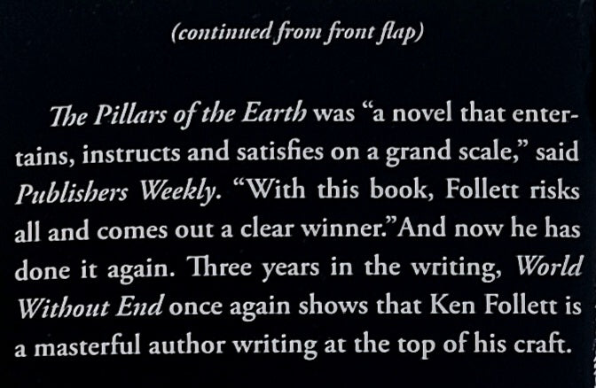 The second installment in Ken Follett's 'Kingsbridge' series (but able to be read as a standalone novel), World Without End takes place two centuries after the townspeople finished building their exquisite Gothic cathedral at the heart of The Pillars of the Earth with the cathedral and the priory again at the center of a web of love and hate, greed and pride, ambition and revenge.