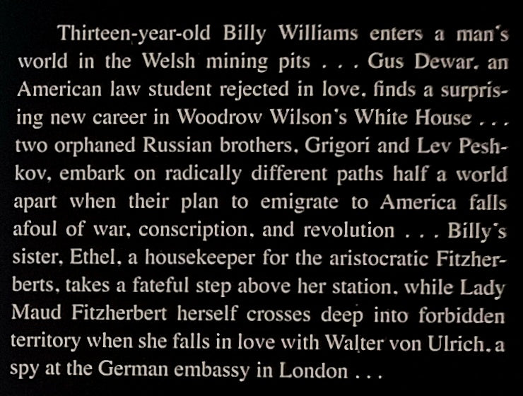Follow the fates of five interconnected families (American, German, Russian, English, and Welsh) as they move through the world shaking dramas of the First World War, the Russian Revolution, and the struggle for women's suffrage . . .