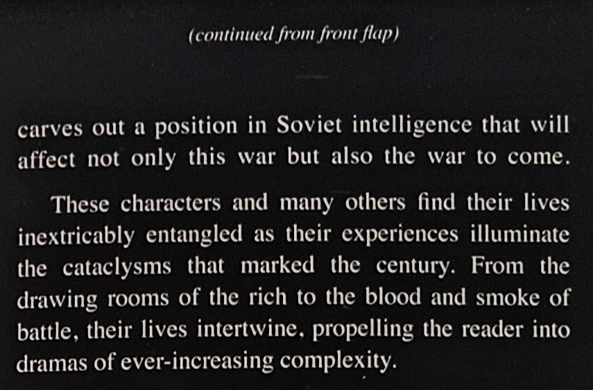 Re-join (or discover for the first time) five interrelated families (of American, German, Russian, English, and Welsh decent) as they enter a time of enormous social, political, and economic turmoil, beginning with the rise of the Third Reich, through the Spanish Civil War and the great dramas of World War II, up to the explosions of the American and Soviet atomic bombs . . .