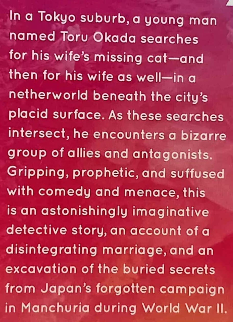 In a Tokyo suburb a young man named Toru Okada searches for his wife's missing cat, and soon finds himself looking for his wife as well in a Netherworld that lies beneath the placid surface of Tokyo . . .