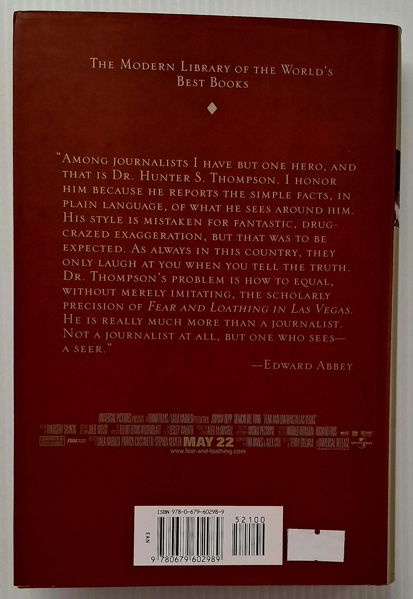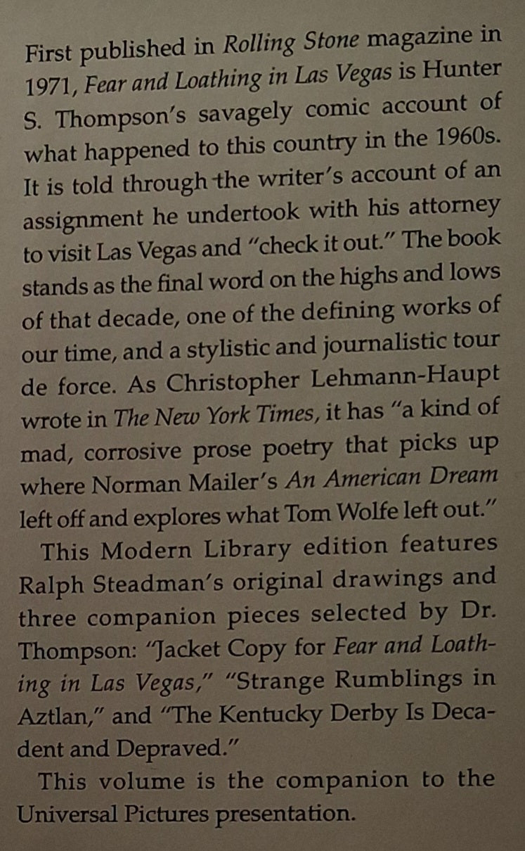 "For Thompson to remember and pen his experiences with such clarity and wit is nothing short of a miracle; an impressive feat no matter how one feels about the subject matter. A first-rate sensibility twinger, Fear and Loathing in Las Vegas is a pop-culture classic, an icon of an era past, and a nugget of pure comedic genius." -- Amazon