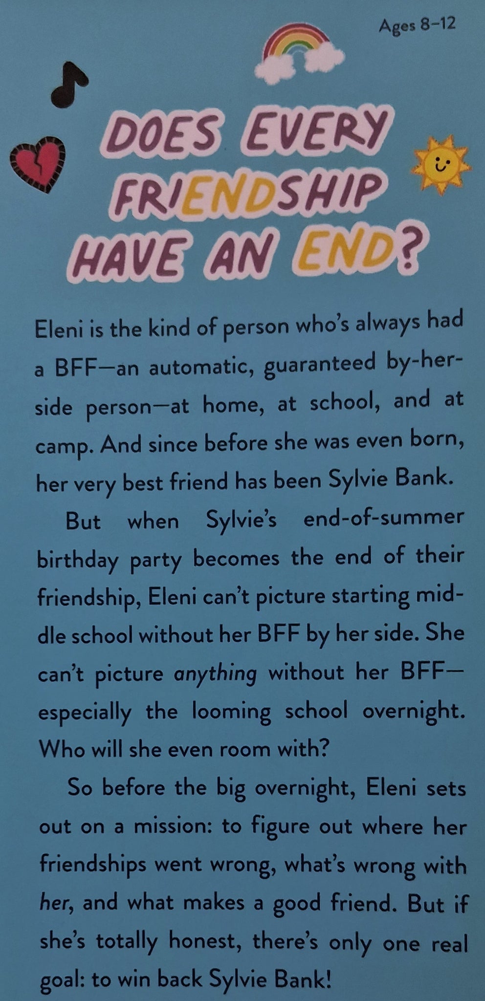 Eleni has always has a BFF (an automatic, guaranteed by-her-side person), but when her best friend's end-of-summer birthday party becomes the end of their friendship Eleni finds herself on a mission to revisit her top five friendship fails and prove she’s totally best friend material!
