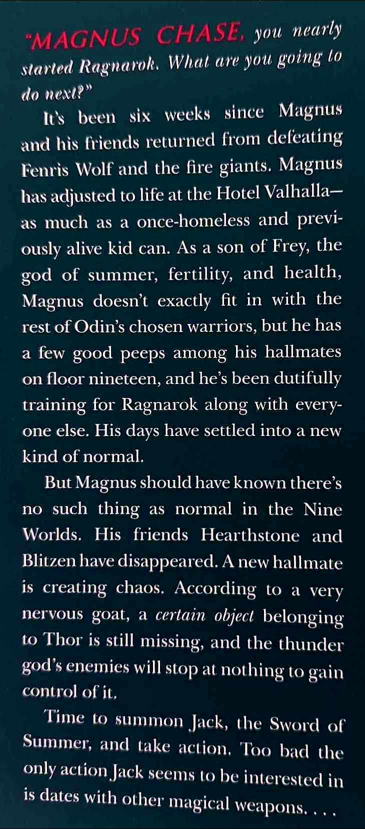 Magnus Chase has seen his share of trouble.  Ever since that terrible night two years ago when his mother told him to run, he has lived alone on the streets of Boston, surviving by his wits, staying one step ahead of the police and the truant officers . . .