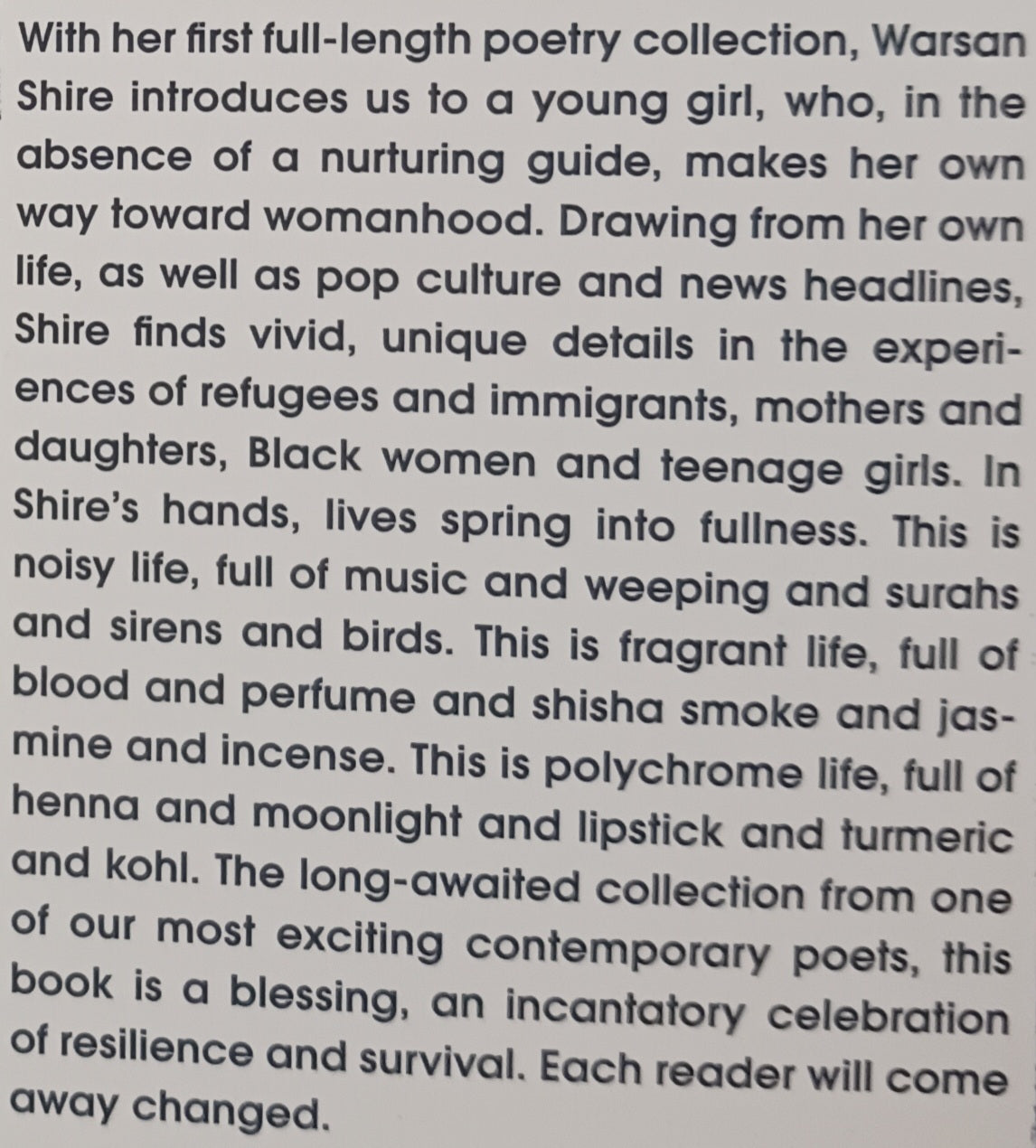 "Warsan Shire electrifies.  The beautifully crafted poems in this collection are fiercely tender gifts." -- Roxane Gay, bestselling author of Bad Feminist, Hunger, and Difficult Women