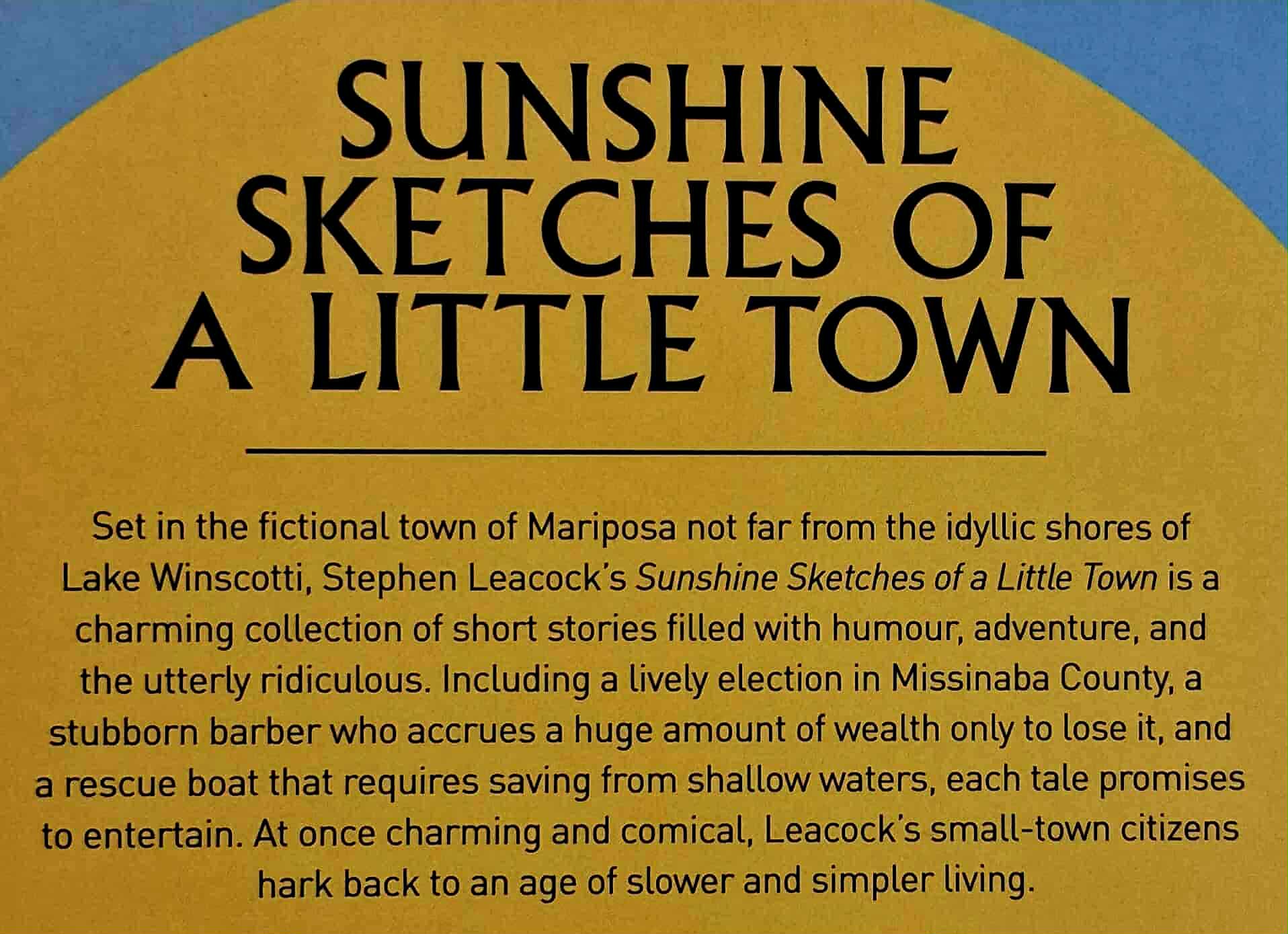 First published in 1912 in serial form and now considered a Canadian classic, Sunshine Sketches of a Little Town paints a quirky and colourful portrait of the eventful goings on in fictional small Ontario town Mariposa, a seemingly ordinary town whose tales are full of poignant reflections, gentle satire, and nostalgic sentiments, and whose inhabitants possess a universality that resounds throughout generations as they live out their 'large' lives in the little town.