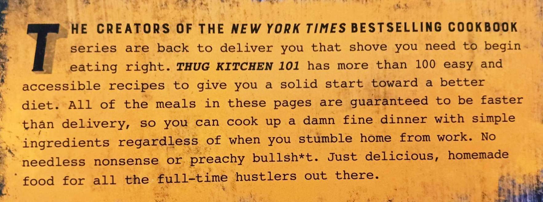 All of the recipes featured within Thug Kitchen 101 are guaranteed to be faster than delivery, so people can easily whip up some tasty meals with simple ingredients regardless of what time they stumble home from work. Health is too damn important to be eating garbage, so 'Thug Kitchen' has made it easy to take care of everybody's number one priority: you.