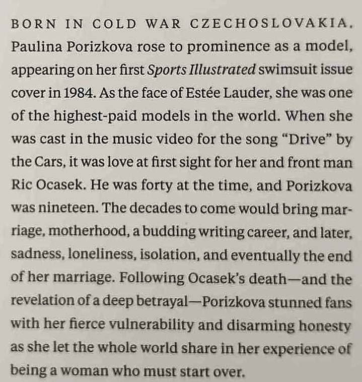 Writing from the heart, Porizkova bares her soul and shares the lessons she has learned (often the hard way) to bring forth a wise and compelling exploration of heartbreak, grief, beauty, aging, relationships, reinvention, and finding one's purpose.
