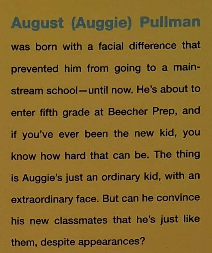 Beginning from Auggie's point-of-view, Wonder then transitions to include the views of his classmates, sister, her boyfriend and others in this poignant tale of fitting in, and not judging a book, or a person, by the cover.
