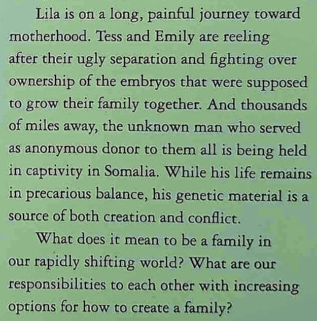 A bold, urgent, and richly imagined novel about what it means to be a family in our modern world, and what our responsibilities to each other are within the framework of increasing options available for how to create a family . . . ?