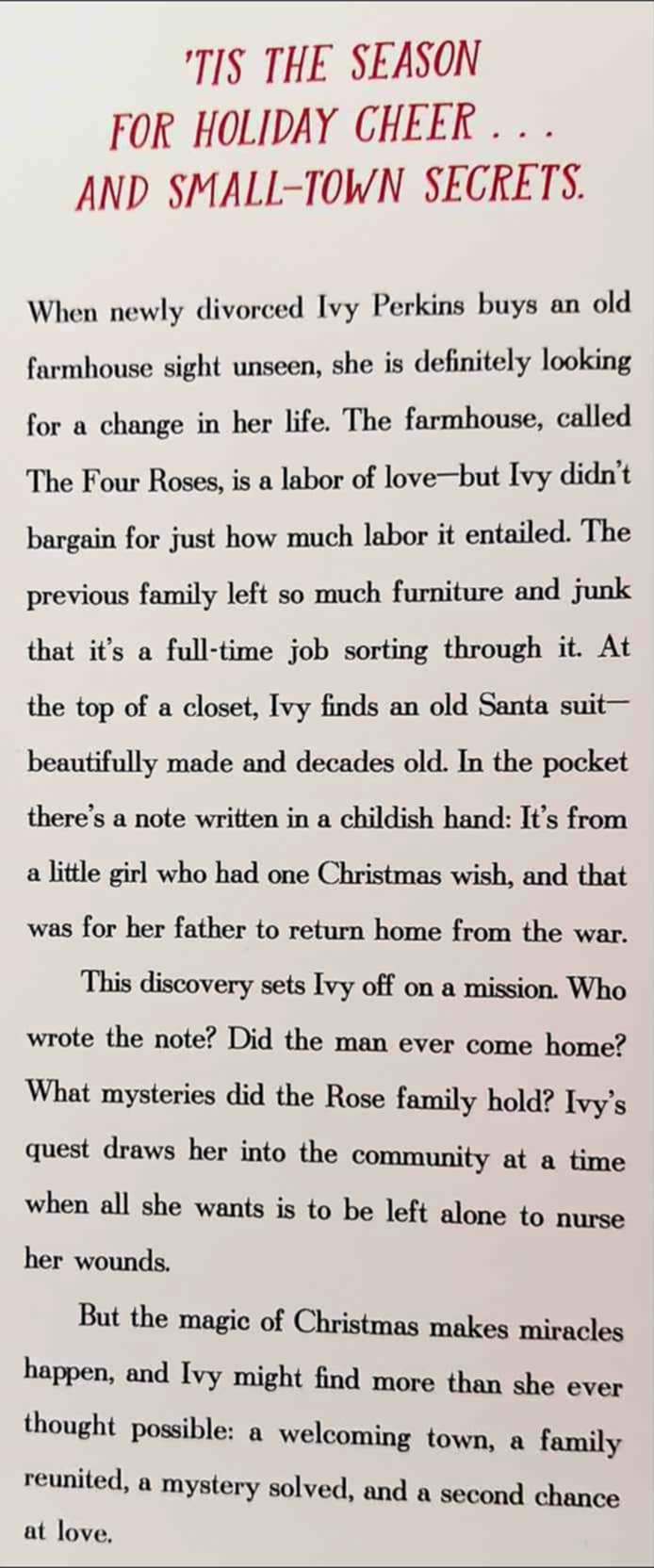 After buying an old farmhouse, sight unseen, newly-divorced Ivy Perkins discovers a note in a decades-old, beautifully made, Santa suit that leads her on a journey that leads to a welcoming town, a family reunited, a mystery solved, and a second chance at love . . .