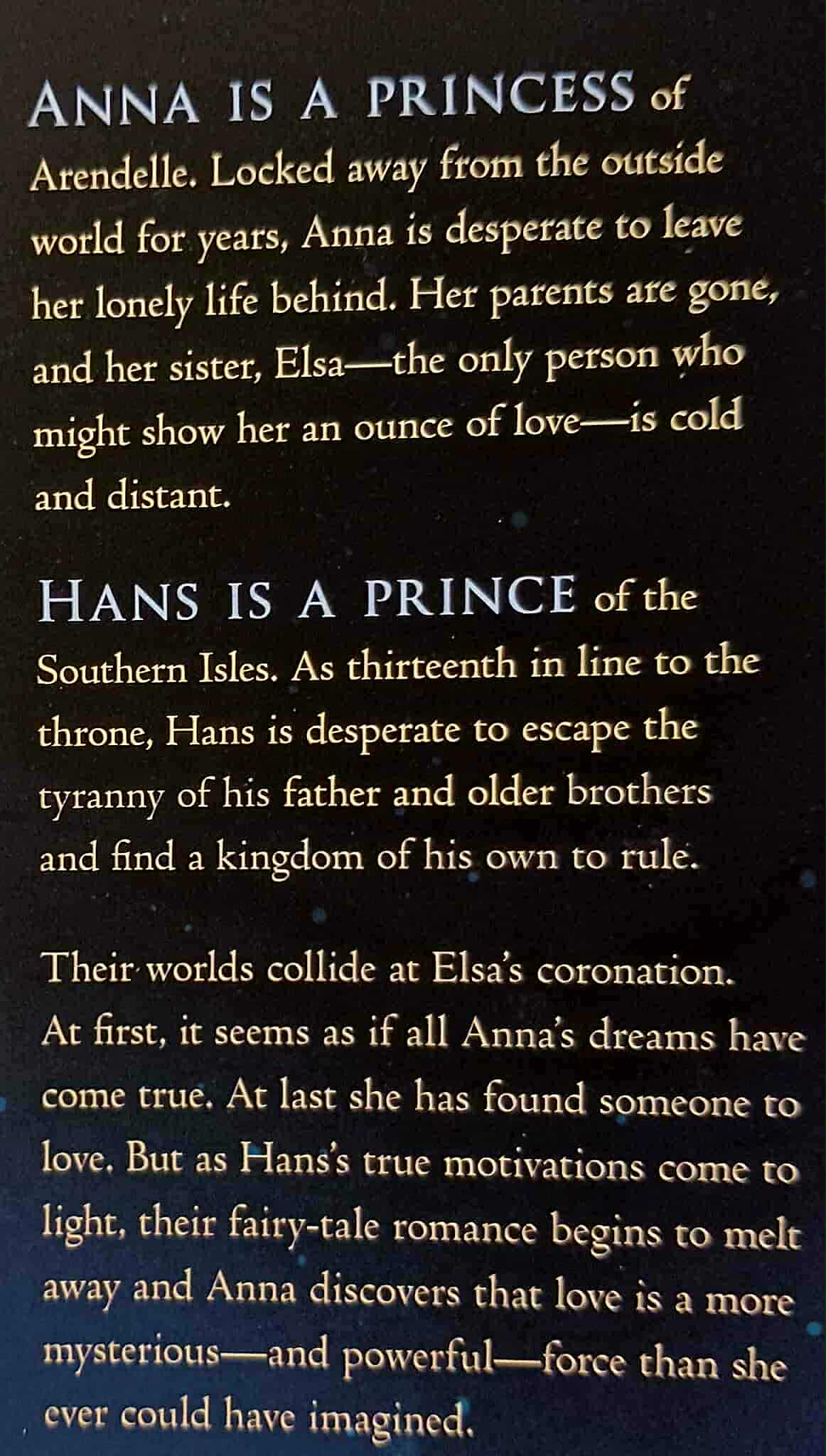 A princess of Arendelle, locked away from the world, Anna is desperate to leave her lonely life behind. When she meets prince Hans of the Southern Isles, it seems as though all of Anna's dreams have come true . . .