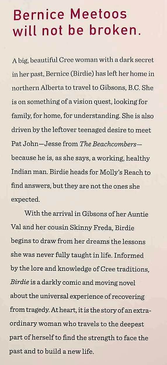 Birdie is a darkly comic and moving first novel about the universal experience of recovering from wounds of the past, informed by the lore and knowledge of Cree traditions. Part road trip, dream quest and travelogue, Birdie touches on the universality of women's experience, regardless of culture or race.