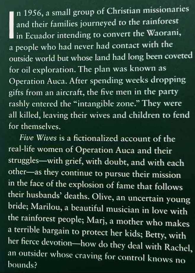 Set in the rainforest of Ecuador Five Wives follows five women left behind when their missionary husbands are killed who must face their struggles (with grief, with doubt, and with each other) as they continued to pursue their evangelical mission in the face of the explosion of fame that followed their husbands’ deaths . . .