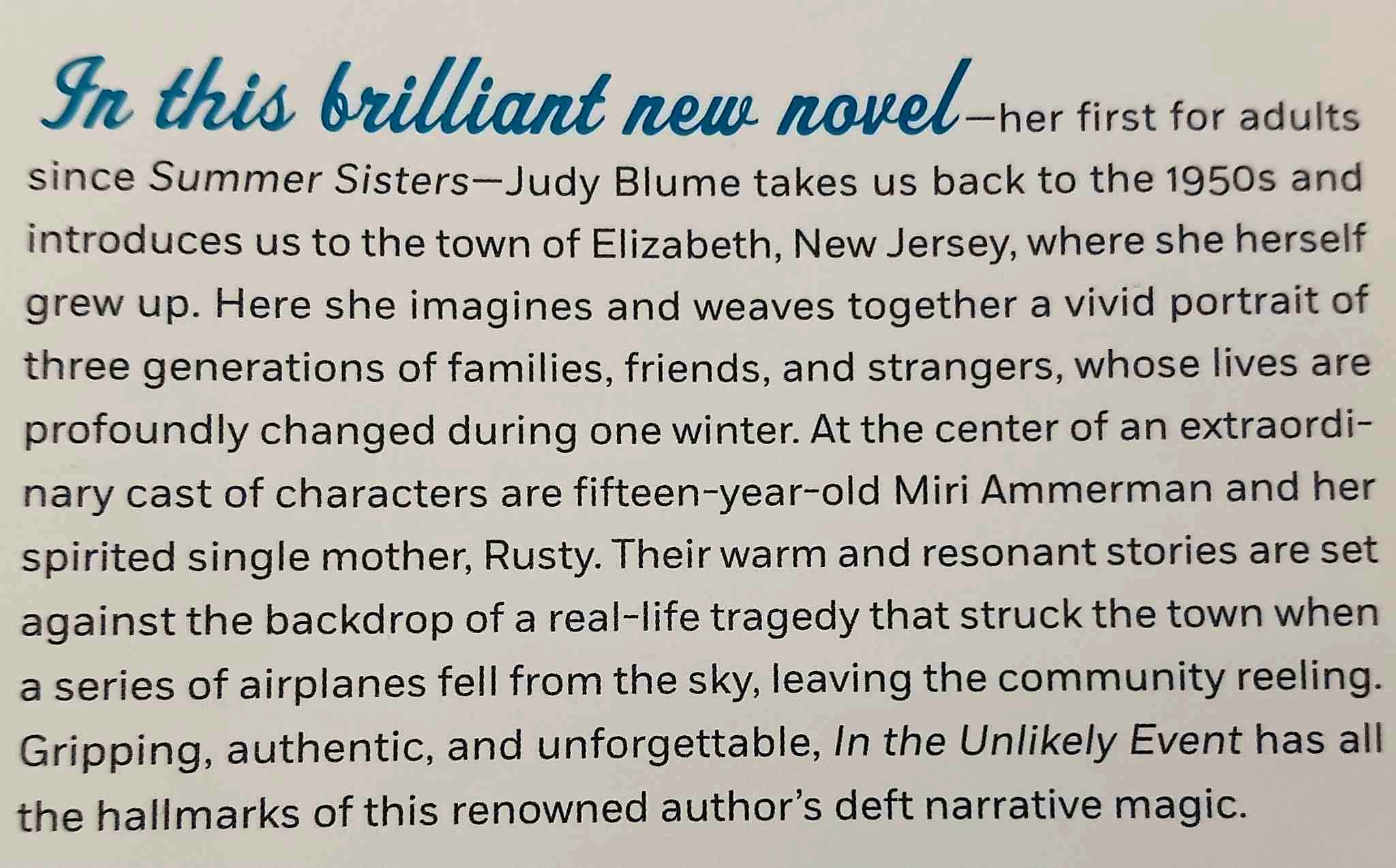 Judy Blume creates with In the Unlikely Event a richly textured and moving story of three generations of families, friends, and strangers, whose lives are profoundly changed by unexpected events . . .