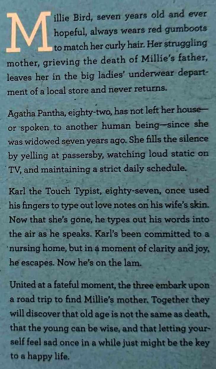 Abandoned by her mother at a department store seven-year-old Millie Bird teams up with eighty-two-year-old widowed agoraphobe Agatha Pantha and eighty-seven-year-old lonely nursing home resident Karl the Typist to find Millie's mom, discovering along the way that breaking the rules occasionally might just be the key to a happy life . . .