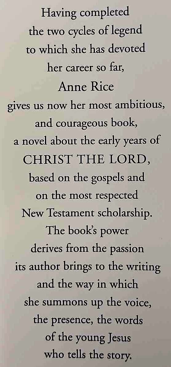 Blending gospel fact with popular myth, Out of Egypt's power is derived from the incredible passion Anne Rice brings to her writing, and the way in which she summons up the voice, the presence, and the words of Jesus who tells the story.