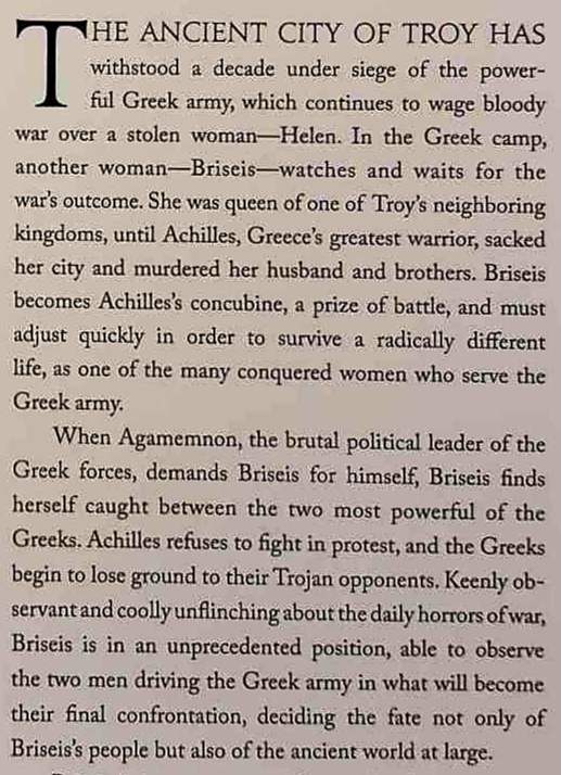 The ancient city of Troy has withstood a decade under siege of the powerful Greek army, which continues to wage bloody war over a stolen woman: Helen. In the Greek camp, another woman, Briseis, watches and waits for the war's outcome. Once queen of one of Troy's neighboring kingdoms, now she serves as Achilles's concubine, a prize of battle, and must adjust quickly in order to survive a radically different life . . .