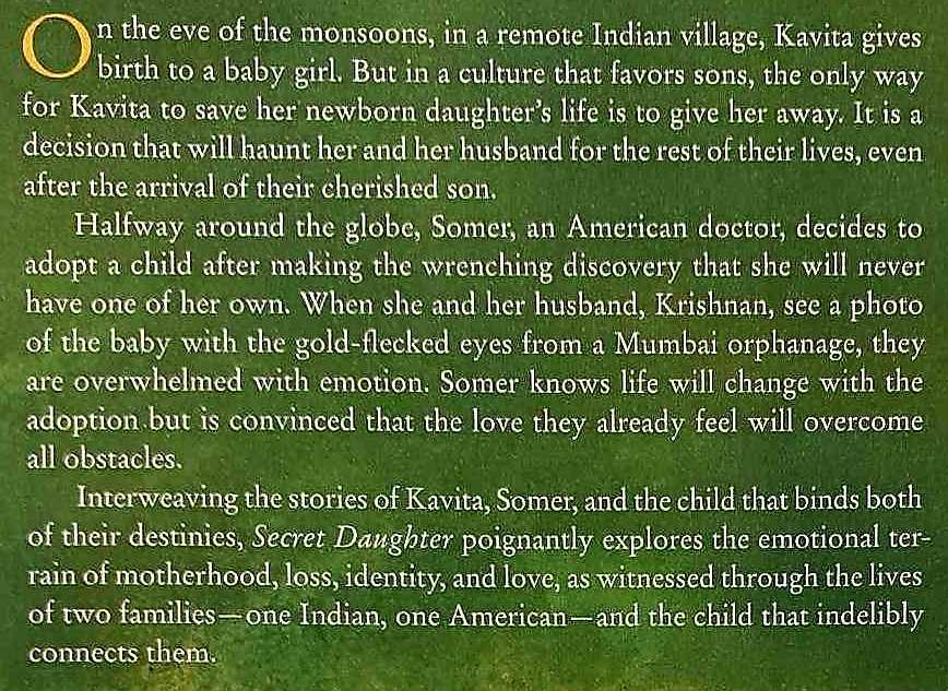 Compulsively readable and deeply touching, Secret Daughter is a story of the unforeseen ways in which our choices and families affect our lives, and the indelible power of love in all its many forms.