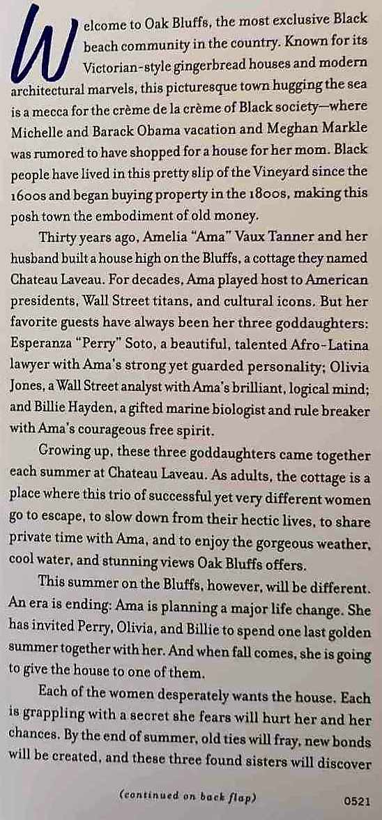Welcome to Oak Bluffs, the most exclusive black beach community in the exclusive Martha's Vineyard area, where over one life-changing summer four unforgettable women come together to fight for the house that binds them . . .