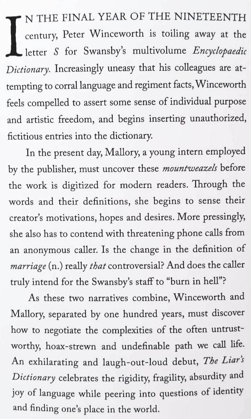 The Liar's Dictionary chronicles the misadventures of a lovelorn Victorian lexicographer and the young woman put on his trail a century later to root out his misdeeds while confronting questions of her own sexuality and place in the world.
