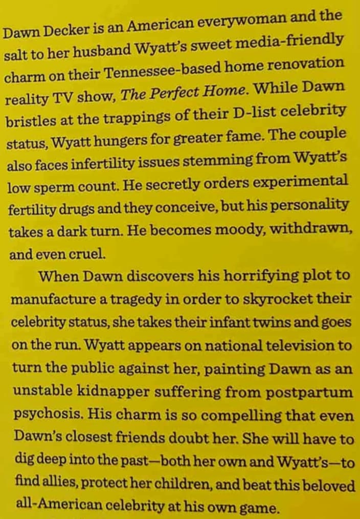 Dawn Decker, an American everywoman and the salt to her husband Wyatt's sweet, media-friendly charm on their Tennessee-based home renovation show, becomes public enemy number one after a horrifying discovery prompts her to flee her celebrity husband with their twin babies . . .