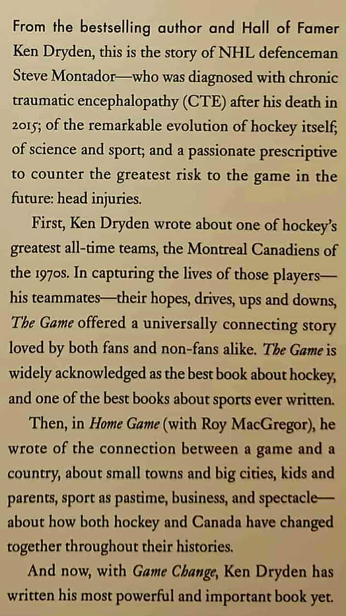 Bestselling author and Hockey Hall of Famer Ken Dryden presents Game Change, which blends the story of NHLer Steve Montador (who was diagnosed with CTE after his death in 2015) and the remarkable evolution of hockey itself with a passionate prescriptive to counter its greatest risk in the future: head injuries . . .