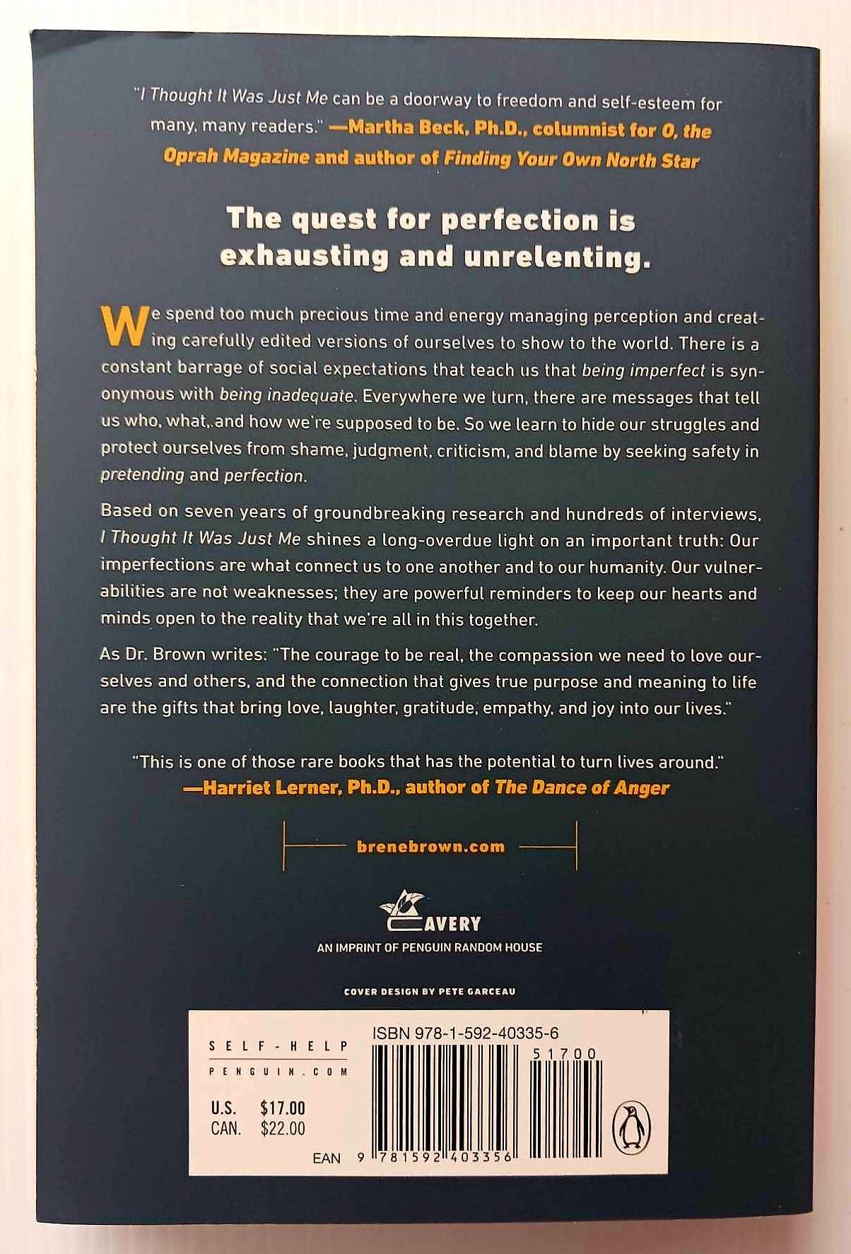 “Shame is a profoundly debilitating emotion. It drives our fears of not being good enough ... I Thought It Was Just Me is an urgent and compelling invitation to examine our struggles with shame and to learn valuable tools to become our best, most authentic selves. Grounded in exceptional scholarship and filled with inspiring stories, this is one of those rare books that has the potential to turn lives around.” -- Harriet Lerner, Ph.D. author of The Dance of Anger