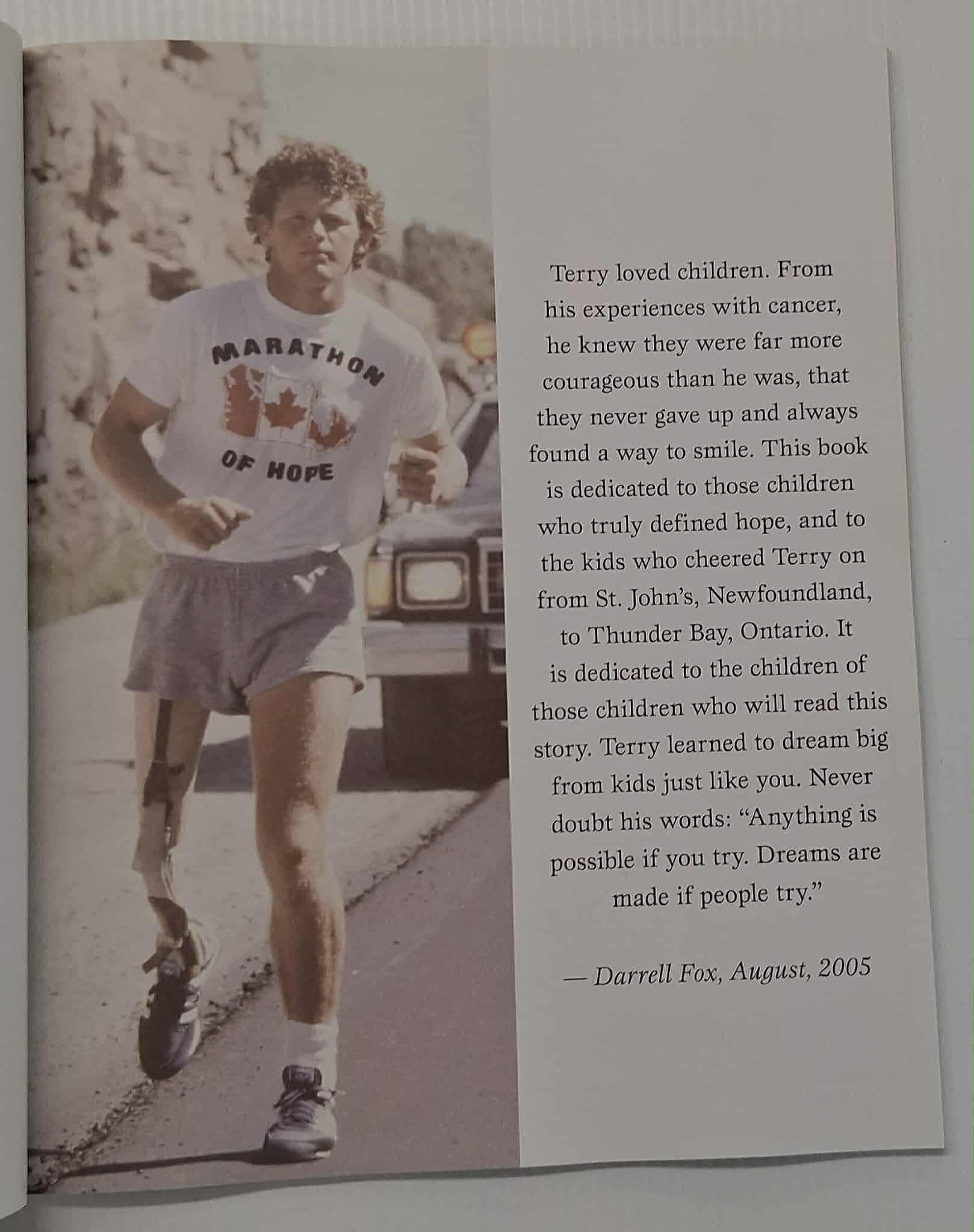 From the time he was very young, Terry Fox liked to finish what he started and tried to do his very best. When his right leg was amputated at the age of eighteen, he worked hard to recover. He was determined to beat cancer, and to help all the children he had met while fighting the disease with his dream to run across Canada to raise funds for cancer research.