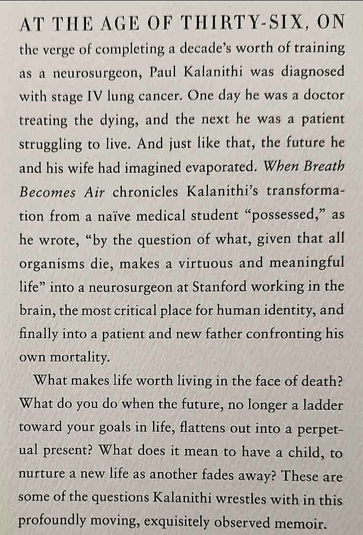 “Thanks to When Breath Becomes Air, those of us who never met Paul Kalanithi will both mourn his death and benefit from his life. This is one of a handful of books I consider to be a universal donor: I would recommend it to anyone, everyone.” -- Ann Patchett, author of The Dutch House, Bel Canto, and Commonwealth