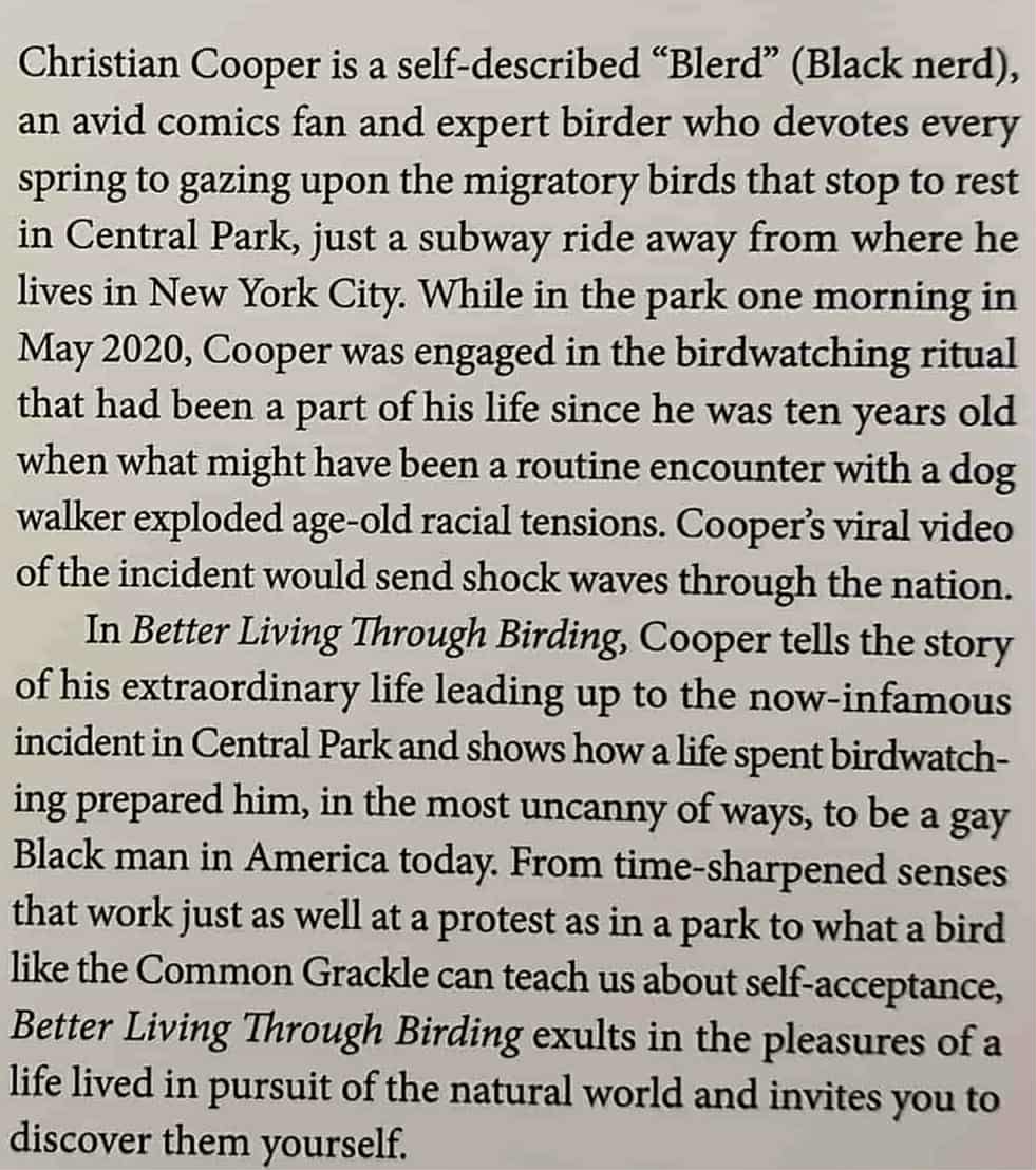 “Christian Cooper’s book is every bit as wondrous and captivating as the birds he so adores. A joyous tour across subcultures and continents, and a masterful account of a life full of song, full of heart, and fully lived.” -- Ed Yong, Pulitzer Prize–winning author of An Immense World