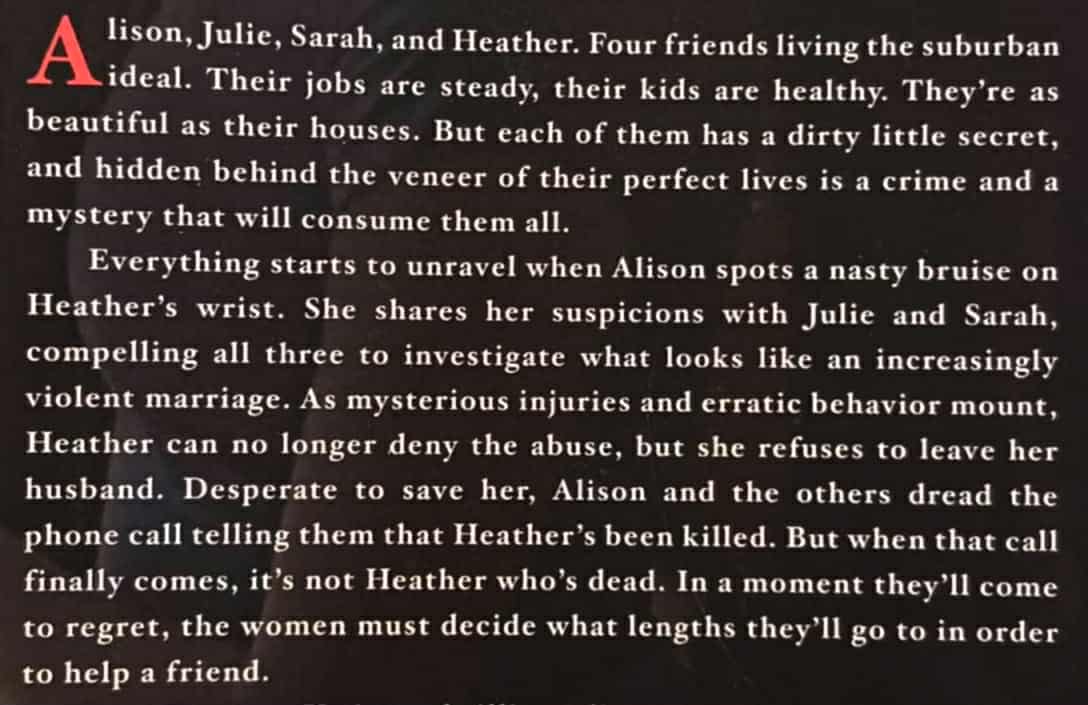 Four suburban mothers and friends each are hiding a dirty, little secret, and hidden behind the veneer of their perfect lives is a crime and a mystery that will consume them all as they conspire to cover up a deadly crime . . .