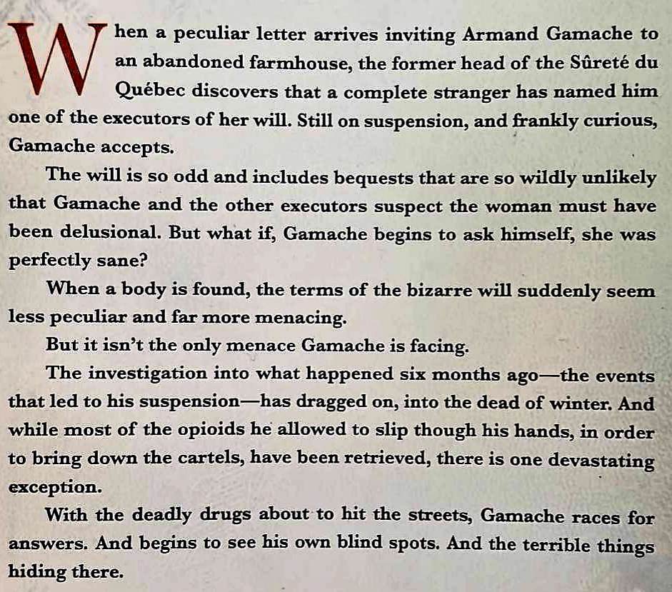 In Kingdom of the Blind, Chief Inspector Gamache uses increasingly audacious, even desperate, measures to retrieve street drugs, Armand Gamache begins to see his own blind spots.  And the terrible things hiding there. . .